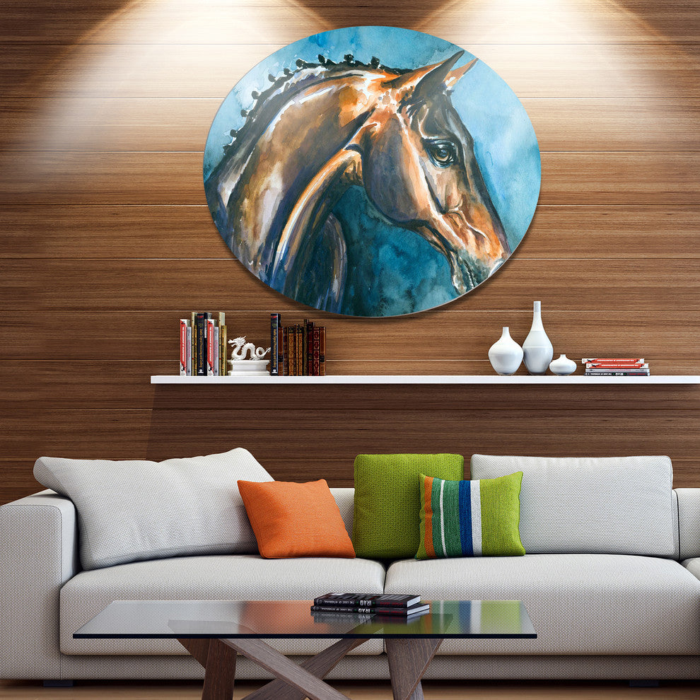 Bring Contemporary Abstraction to your home with this large Circle Metal wall art. This Brown Horse on Blue Watercolor Metal Artwork makes it the focal point of any room or office.