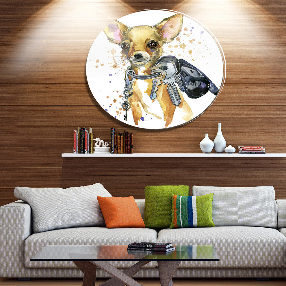 Bring Contemporary Abstraction to your home with this large Circle Metal wall art. This Brown Toy Terrier Dog Watercolor Metal Artwork makes it the focal point of any room or office.
