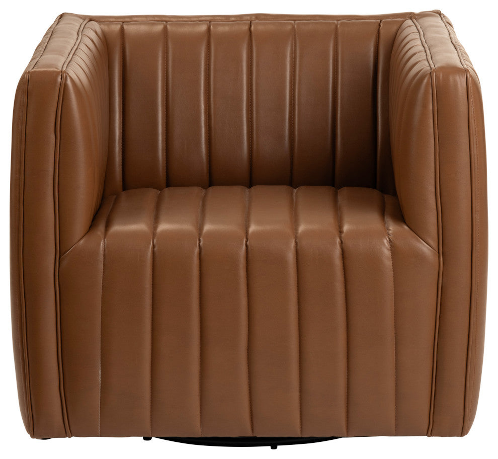 Introduce timeless sophistication to your living space with this stunning brown accent chair. Crafted with a durable iron base and upholstered in sleek faux leather, the chair features a fixed seat cushion with a plush foam interior, providing both style and comfort. Its boxy silhouette is accentuated by vertical channel stitching and a coordinating brown welt trim. The rich brown tone adds warmth to any room. Ready to use out of the box, this chair combines functionality and elegance effortlessly