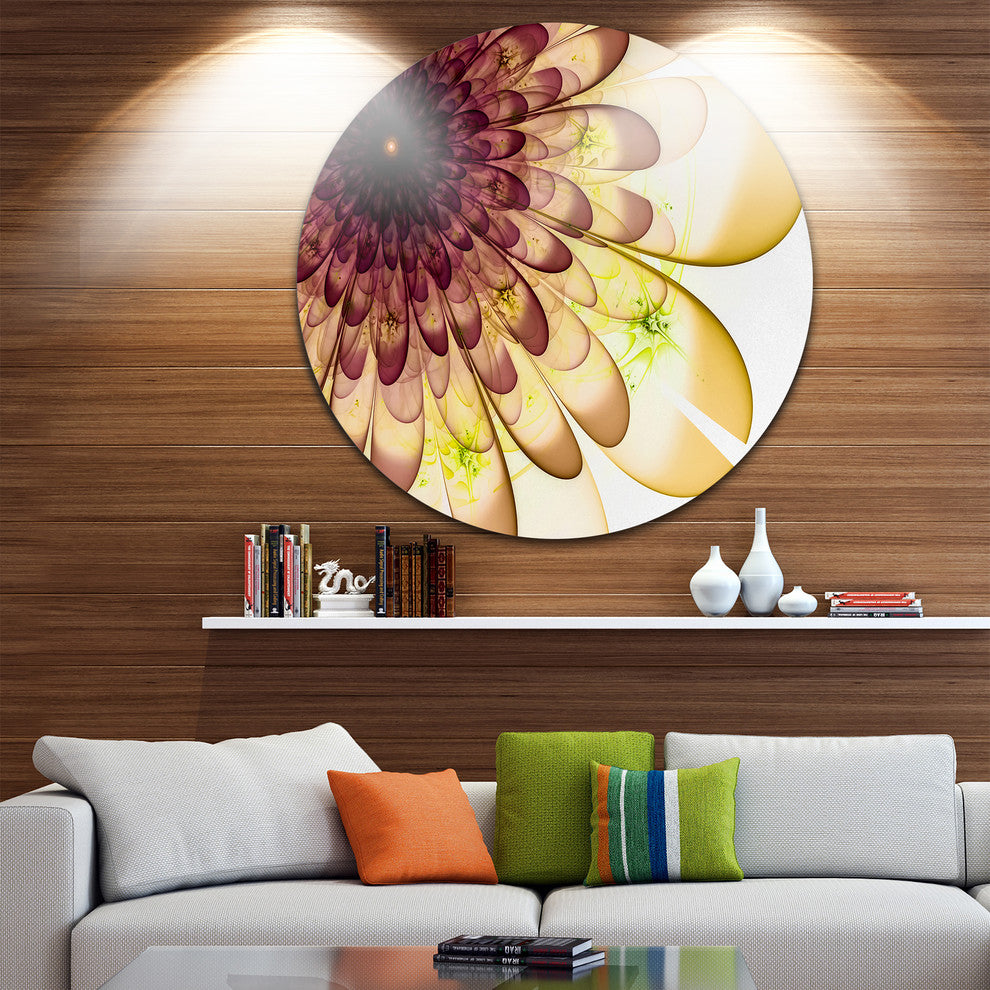 Bring Contemporary Abstraction to your home with this large Circle Metal wall art. This Brown Yellow Typical Flower Fractal Metal Artwork makes it the focal point of any room or office.
