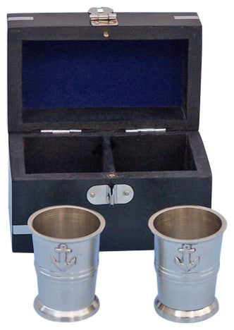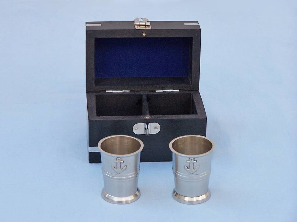 Brushed Nickel Anchor Shot Glasses With Rosewood Box 4'', Set of 2