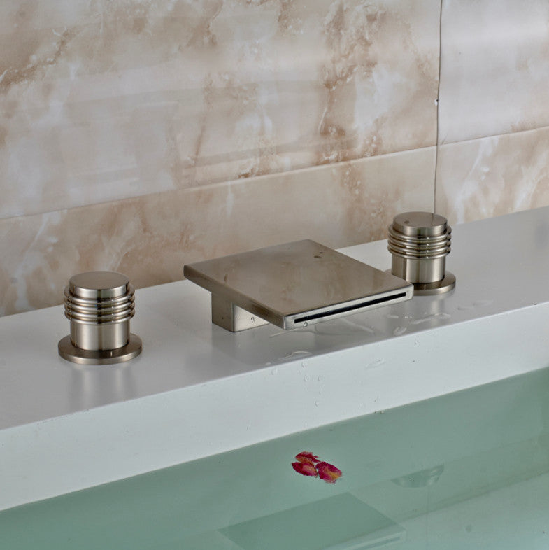 Untitled DocumentDual Handle Waterfall Deck Mount Brushed Bathroom Basin Sink Faucet Mixer TapProduct Specification: Function: Bathroom Sink and Bathtub FaucetFeature: WaterfallStyle: ContemporaryFinish: Brushed Nickel FinishedInstallation Holes: Three HolesNumber of Handles: Two HandlesValve Type: Ceramic ValveFaucet Body Material: BrassFaucet Spout Material: BrassFaucet Handle Material: BrassType: Bathroom Tub and Sink faucetFlow Rate: Maximum 1.8 GPMAerator Included: Minimum .5 GPMSurface treatment: Brushed NickelInstallation: Three hole, Deck mountedFaucet mount: 4" Mini spreadValve core material: CeramicWater mixer: Hot and ColdSpout Length: 11cm(4. 3")Spout Width: 13. 4cm(5. 2")
