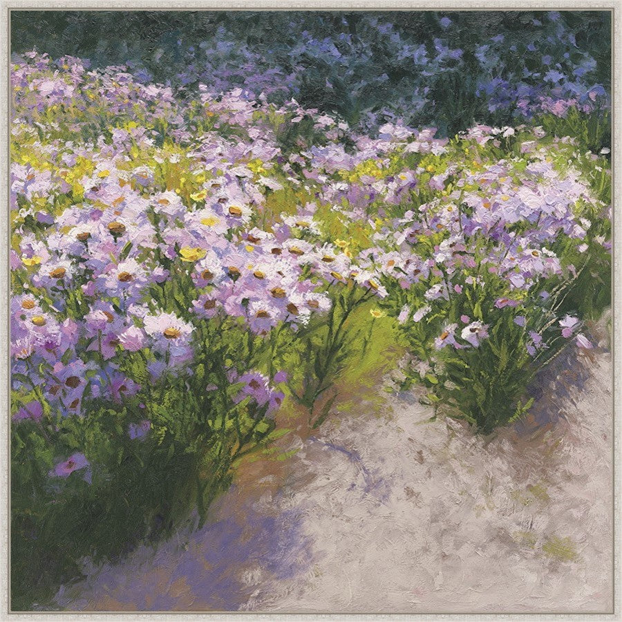 36.25 x 36.25 inch framed size (approximately). High quality canvas print framed in a white rustic wooden float frame. Beautiful floral image in vibrant puple tones. This stretched canvas art print is produced using specialized digital printing technology. The image is printed directly onto quality grade artist canvas and then gallery wrapped around wooden bars. The giclee printing technique produces vibrant colors and a high quality glossy finish. Giclee is a French term meaning "spraying of ink". This wrapped image is framed in a float frame. These unique frames are so named because the illusion they create is that your artwork is "floating" within the frame instead of being covered by it ��� this is the perfect way to display a gallery wrapped canvas. This is a beautiful piece of framed artwork from our "In Bloom" collection that will look great in any home. Hanging hardware included.