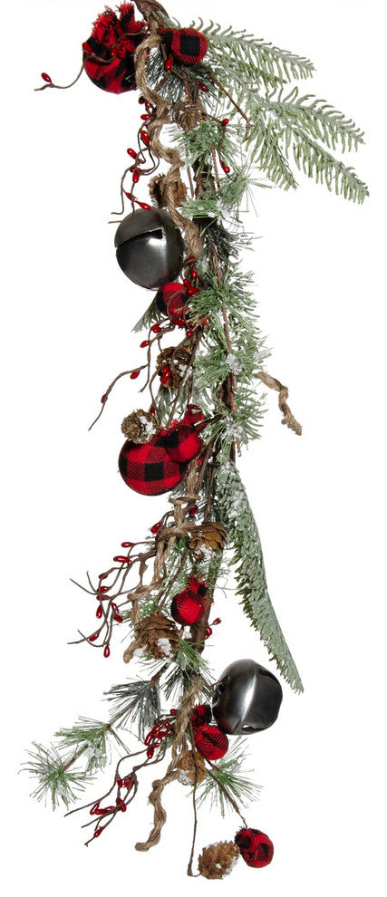 The Buffalo Gingham Country Holiday Garlandeasily brings elegance and rustic charm to your home. Boastingflocked evergreen, red pip berries,silver jingle bells, pine cones, jute string,andred and black buffalo check ornaments, this garland is the epitomy ofcountryChristmas charm. Drape it over a mantelpiece or hang it from a banister to complete a warm and inviting winter display. Measures 4 feet long.