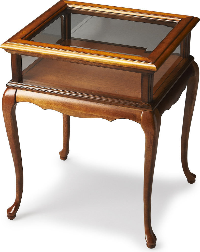 Selected hardwoods and choice cherry veneers. Cherry veneer on display surface and aprons. Glass sides and hinged glass framed top.