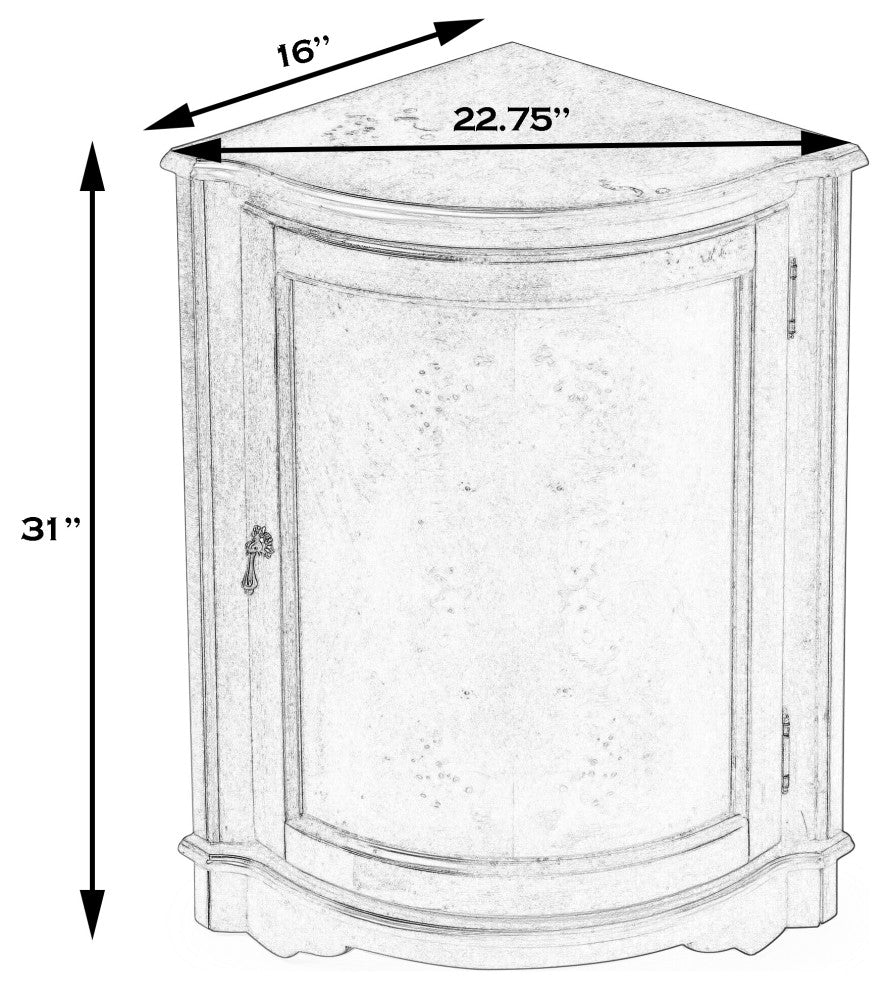 Perfect for dressing up a neglected corner, this cabinet features olive ash burl veneers along its top and door panel. The door, adorned with a pull in an antique brass finish, opens to reveal a shelf within its always-welcome storage space. Crafted from select wood solids and wood products.