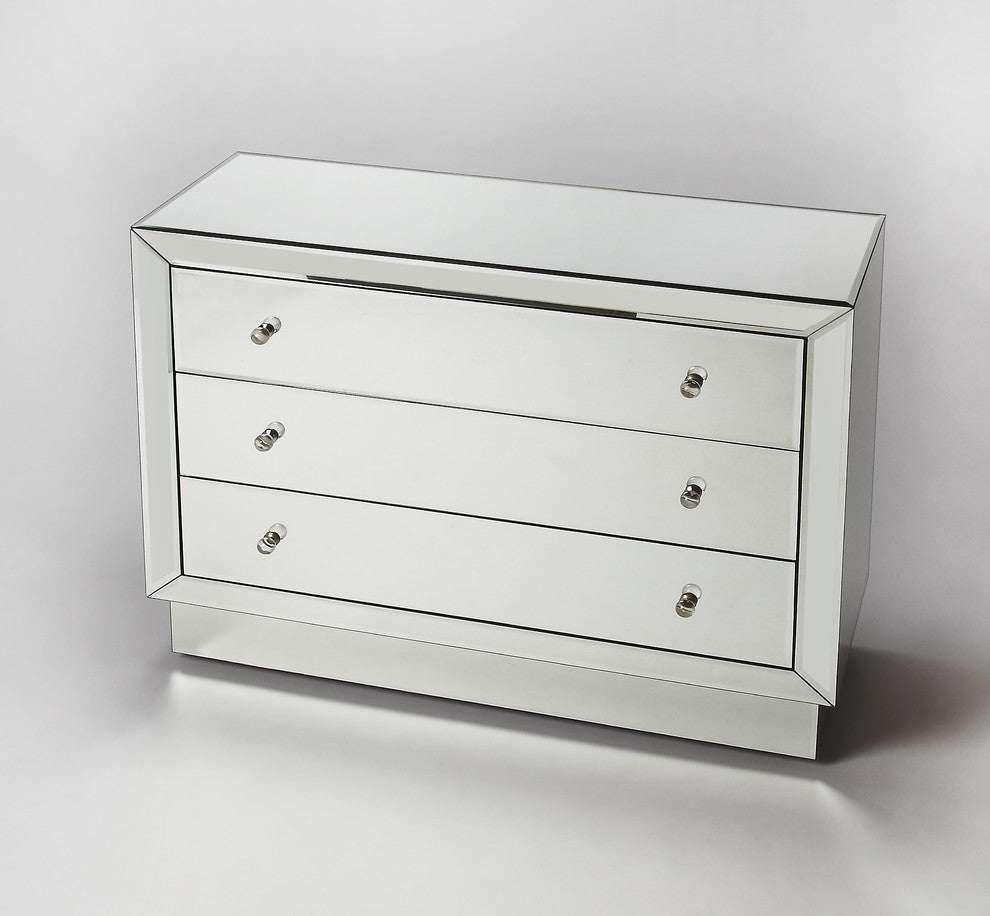 Dressed in true urban sophistication, this dresser is sheathed in mirror, even the deep, platform base. Handcrafted miteredecorners and attention to detail demonstrate superior workmanship. Reflect the soothing shades or bright ambiance of any room with this practical, but not extravagant chest.