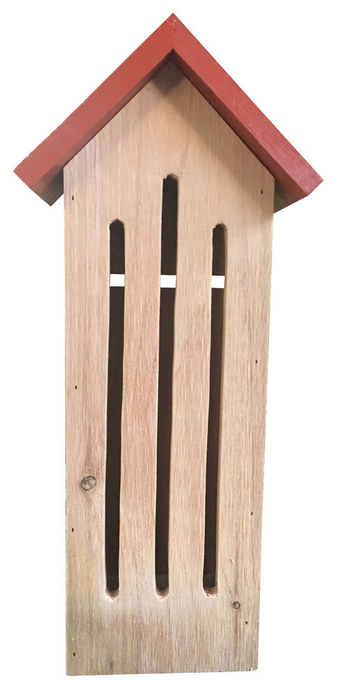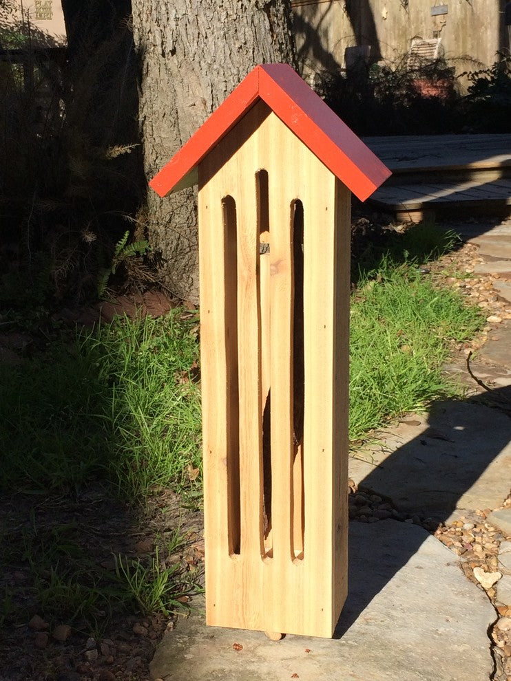 This Butterfly house with a red roof is a great hint of color among the flowers of your garden. It provides a safe resting place on the bark strips from predators when set among the flowers. It has been handcrafted with premium cedar wood, each house is unique in their own way. Also comes in natural, yellow or green roof. Built for functionality with ventilation, back door opens and closes for easy cleaning. Bark and pole included. This is our best seller!!!
