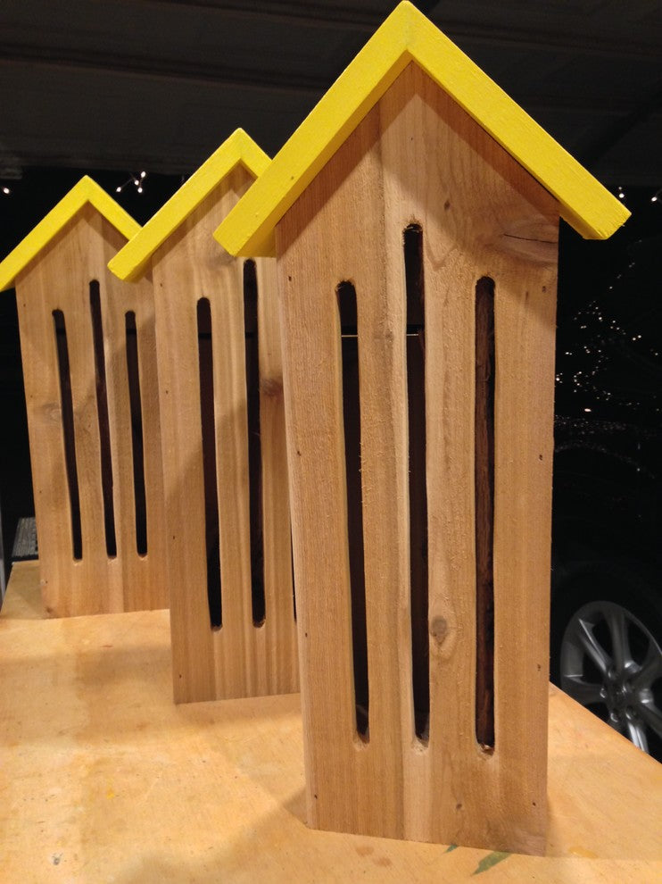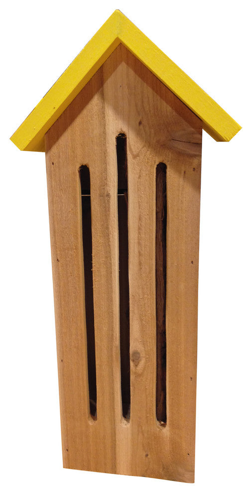 This Butterfly house stands out with its yellow sunny roof. It provides a safe resting place on the bark strips from predators when set among the flowers. It has been handcrafted with premium, cedar wood and each house is unique. Back door opens and closes for easy cleaning. Also comes in natural, red or green roof.