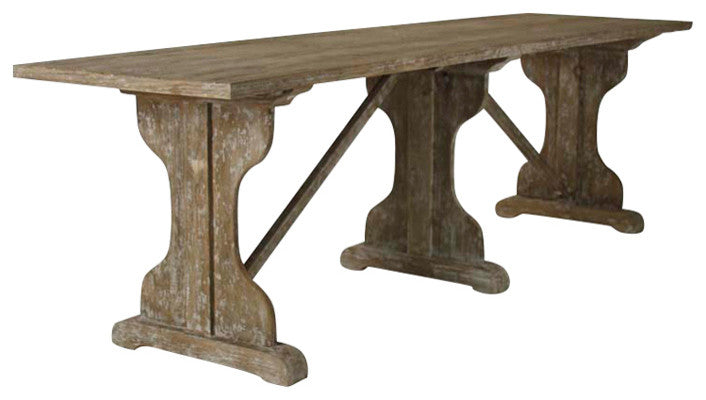 Console with three trestle legs and diagonal stretchers in distressed finish.