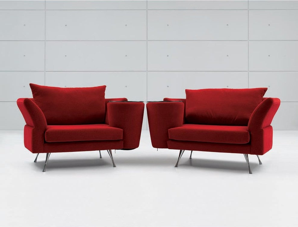 The Cafe Chair is a unique piece with a built-in clear tempered glass side table that can be on your right or left-hand side. Relax like royalty in the cocoon of plush red velvet fabric while you have a cup of coffee or tea. Great for your reading nook or even an accent chair in receptions and offices. The configuration is determined when you are standing in front looking at the chair. The cushions on this chair are removable. Also available in black velvet and gray velvet. Fabric swatches are available upon request. Please contact the showroom for more information.
