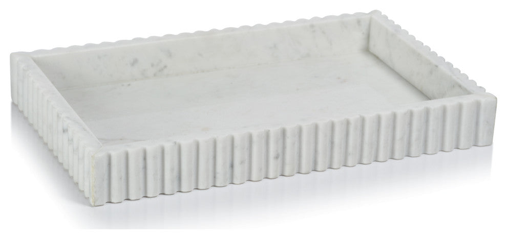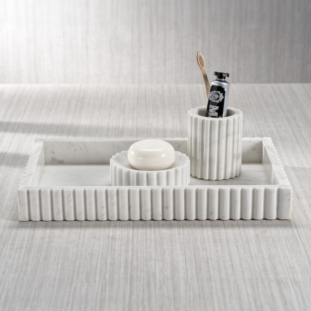 Arrange your beauty essentials into a stunning display of products by bringing home this marble vanity tray. This tray features honed marble finish with scalloped sides for a charmingly modern look that is sure to add a dash of sophistication to your dressing space. What a pretty way to keep your jewelry and trinkets safe and show off the good stuff.