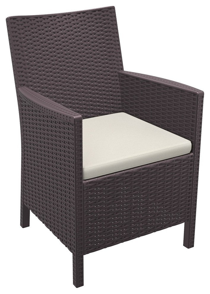 California wickerlook patio seating set with 4 arm chairs, 2 square side tables and 1 rectangle coffee table. California chair is a heavy duty chair with 23 overall weight. No metal parts to rust. Set items offer easy assembly, requires no tools.Comercial durability. UV treated. Great comfort for the money.