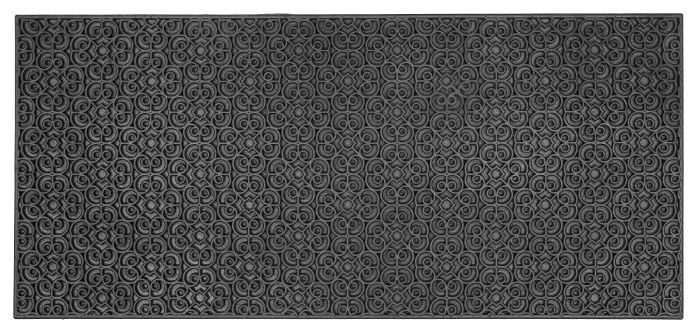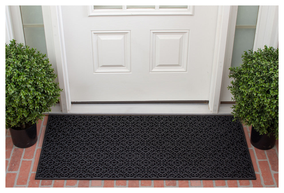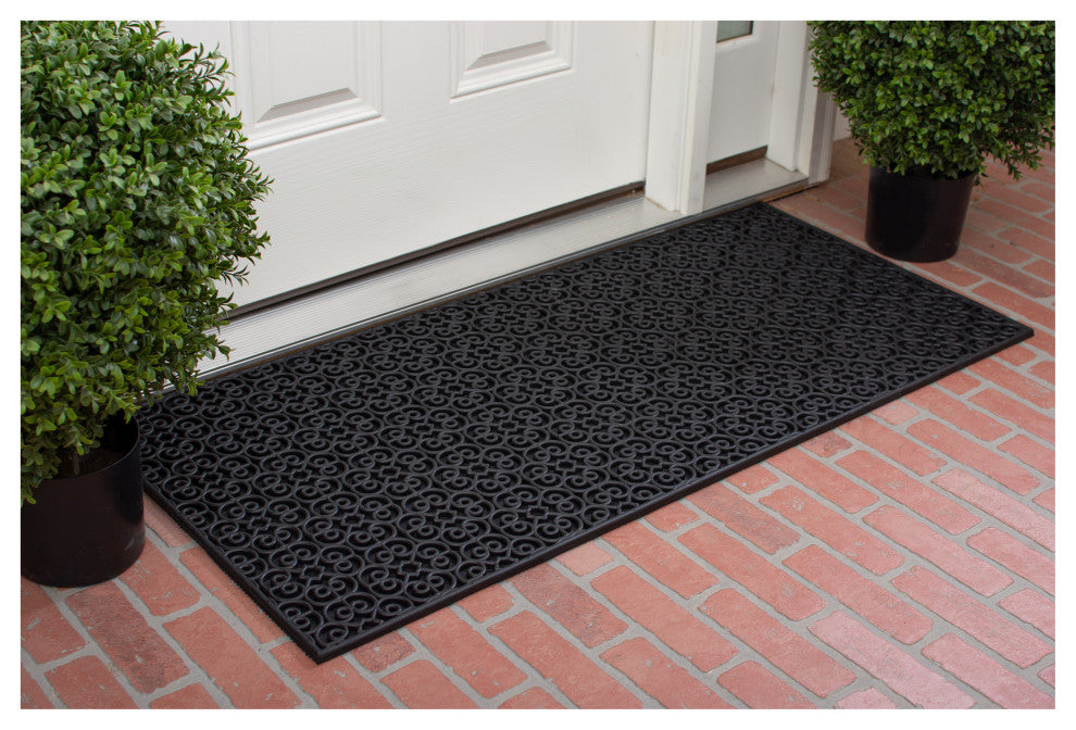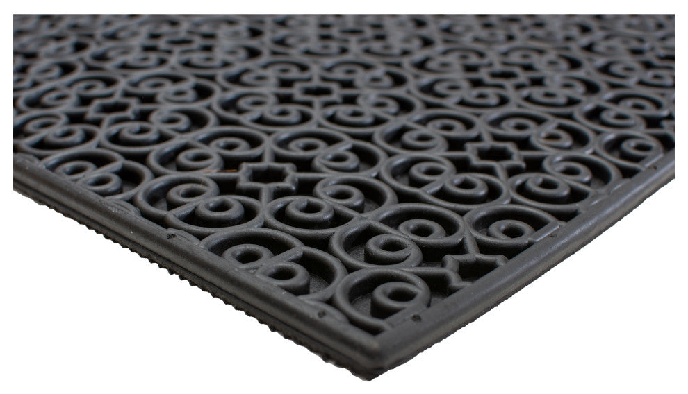Over-sized to provide more coverage, this beautiful doormat is made of 100% rubber and is impervious to the elements of weather. Detailed scroll that emulates wrought iron, this heavy-duty mat makes a gorgeous addition to any porch or patio area. Hose clean.