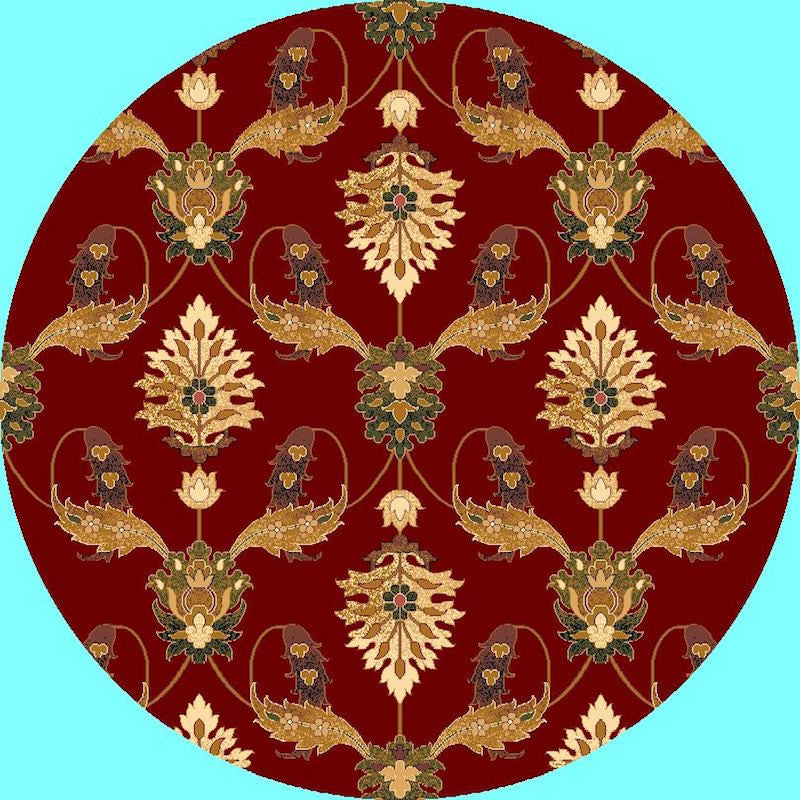 Cambridge 7364 Red Palazzo 7''7" Round. Machine-Made of 100% Heat-set Polypropelene with No Backing. Made in China. Vacuum regularly & spot clean stains. Professional cleaning recommended periodically.