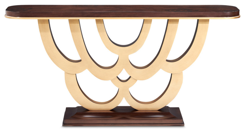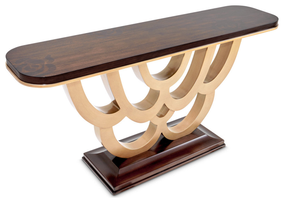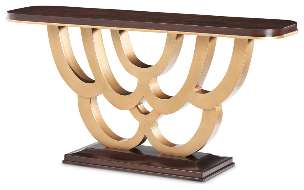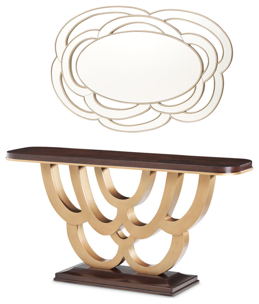 The Camellia Field Console Table and Mirror Set exudes bold artistry and refined craftsmanship. The table''s mahogany veneer top, finished in warm pecan, is complemented by a sculptural base in antique gold, reminiscent of cascading petals. Designed with an intricate layered frame inspired by camellia petals, the mirror radiates artistry and dimension. Perfect for an entryway or living space, this set blends practical function with eye-catching design.