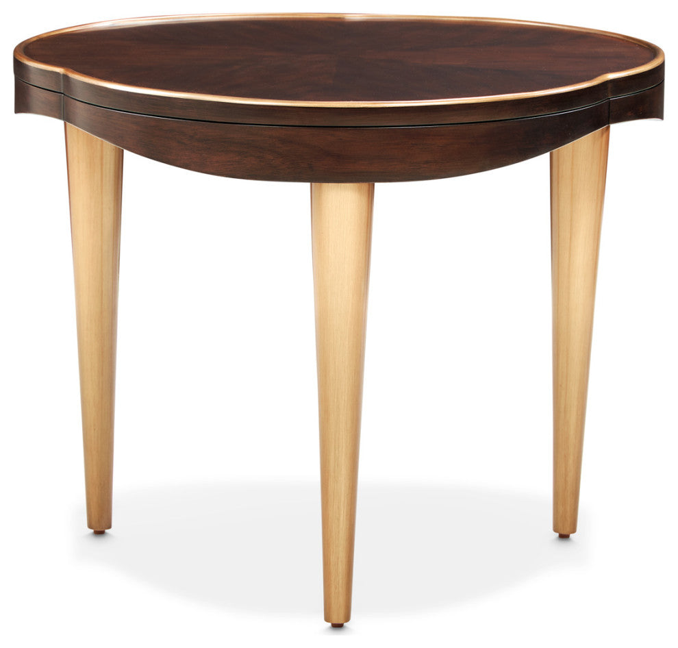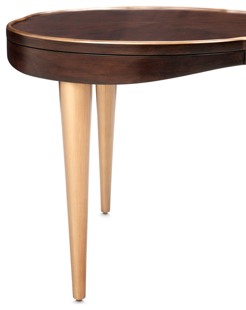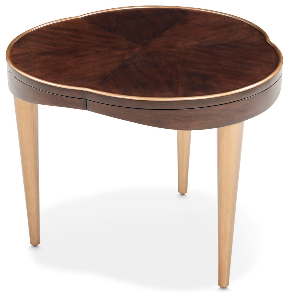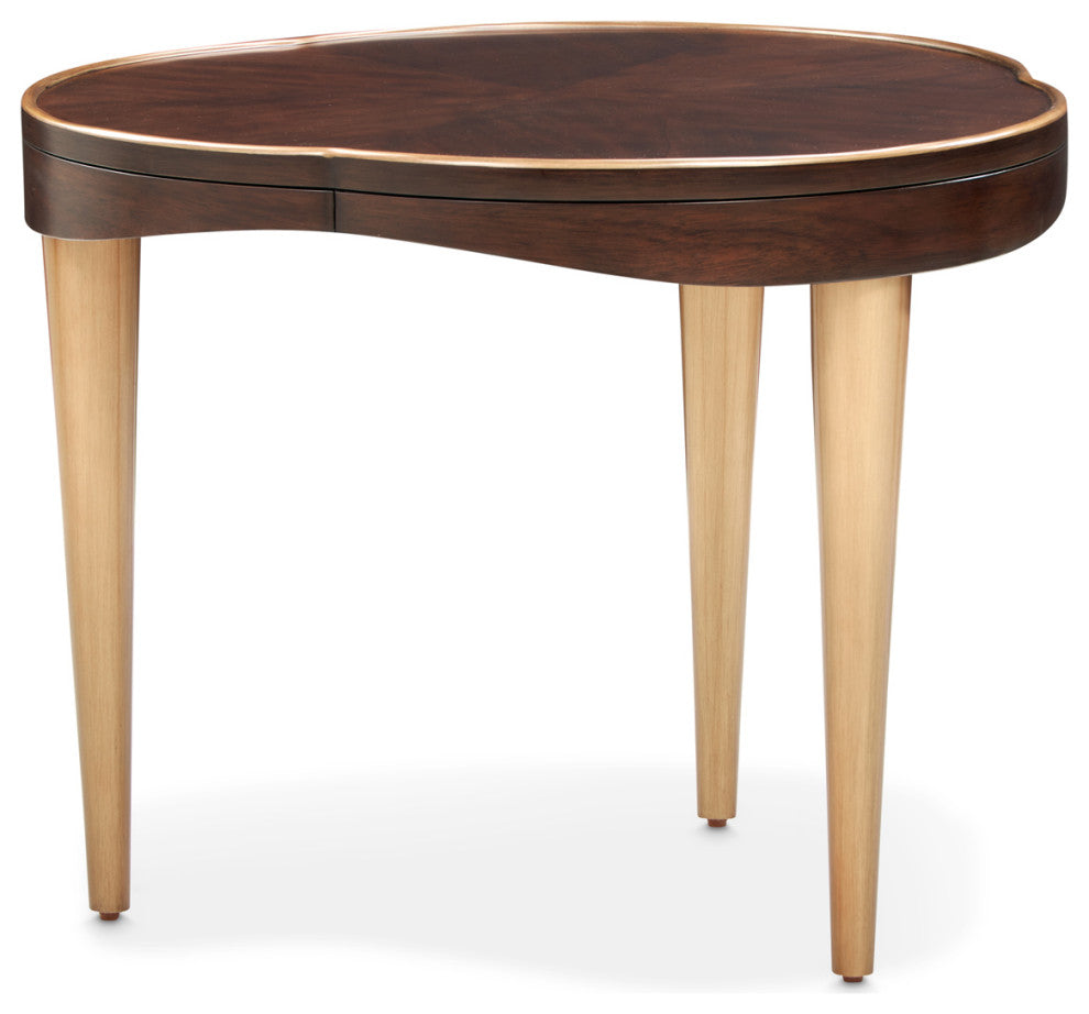 The Camellia Field Shaped End Table brings a distinctive silhouette to your living space with its soft, curving form and warm pecan finish. The mahogany veneer top is framed with antique gold accents, highlighting its organic elegance. Perfectly designed to add visual interest, this end table pairs beauty with versatility.