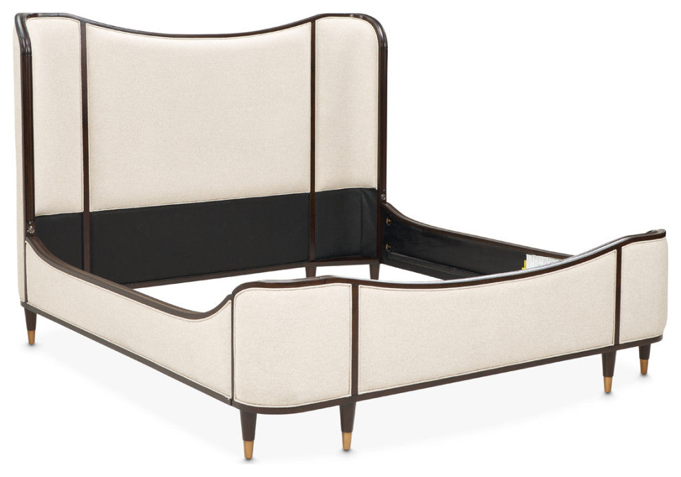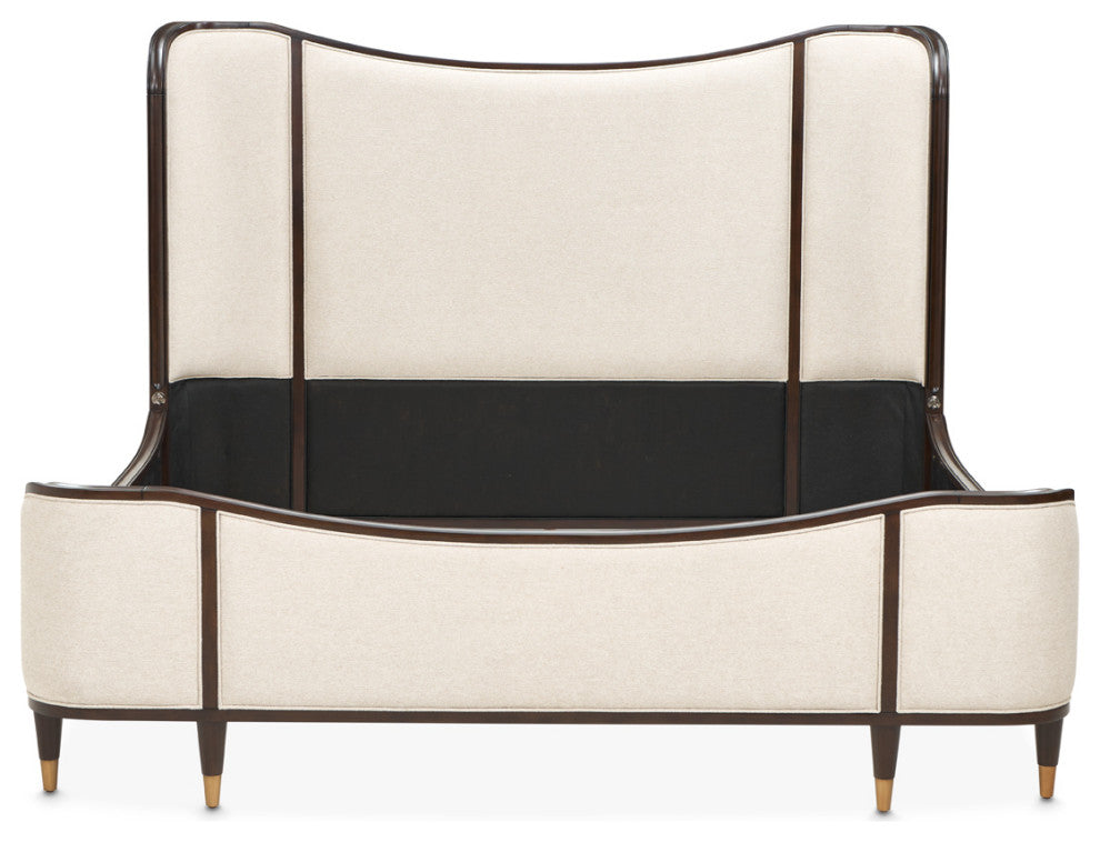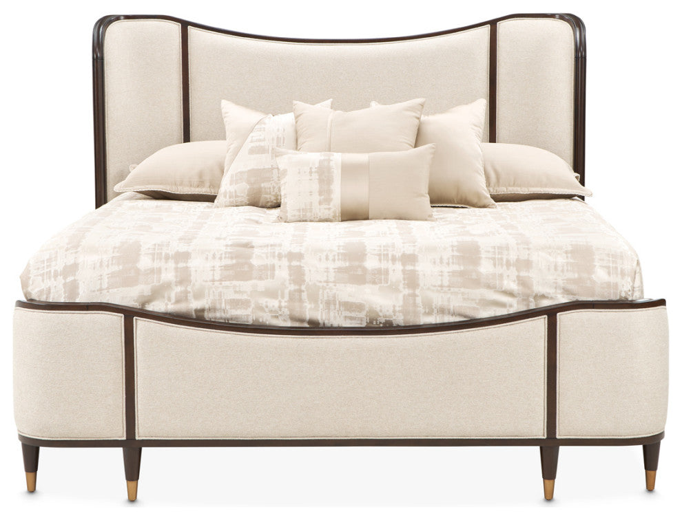 Transform your bedroom into a sanctuary with this exquisitely designed bed. The graceful curves of the headboard and footboard are framed by a warm walnut finish, creating a sense of refined charm. Upholstered panels in a luxurious chenille fabric provide softness and texture, while built-in USB ports add modern functionality. Tapered legs with gold accents complete the look with a subtle touch of luxury. A timeless centerpiece for any serene retreat.