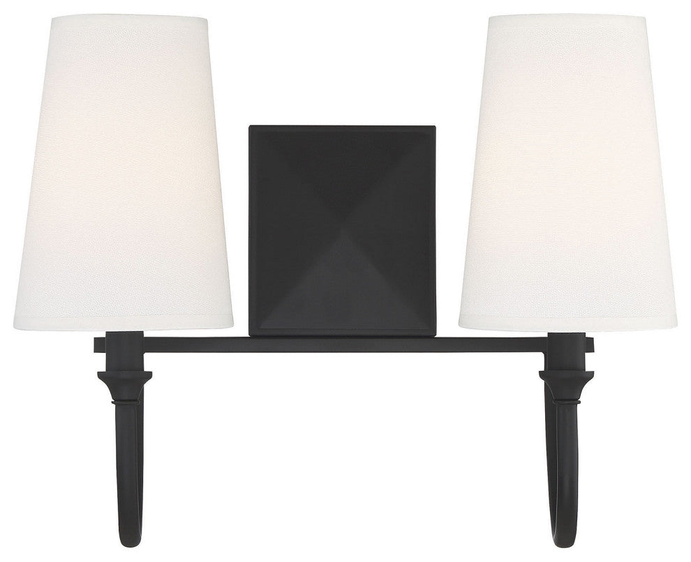 Bring the understated, classic beauty of the Savoy House Cameron 2-light bath bar into your home to create a thoughtful accent in any bathroom. This vanitylight features slender, dramatically-curving arms topped with tall, tapered white fabric shades, ensuring a flattering glow. The faceted backplate adds another dimension of style, too. Finished in matte black. This fixture is 15" wide and 12" tall. It extends 8" from the wall. Uses 2 candelabra size bulbs of up to 40 watts each (not included).Bulb Type: E12UL Listed: UL/CULHardwire or Plug: Hardwire