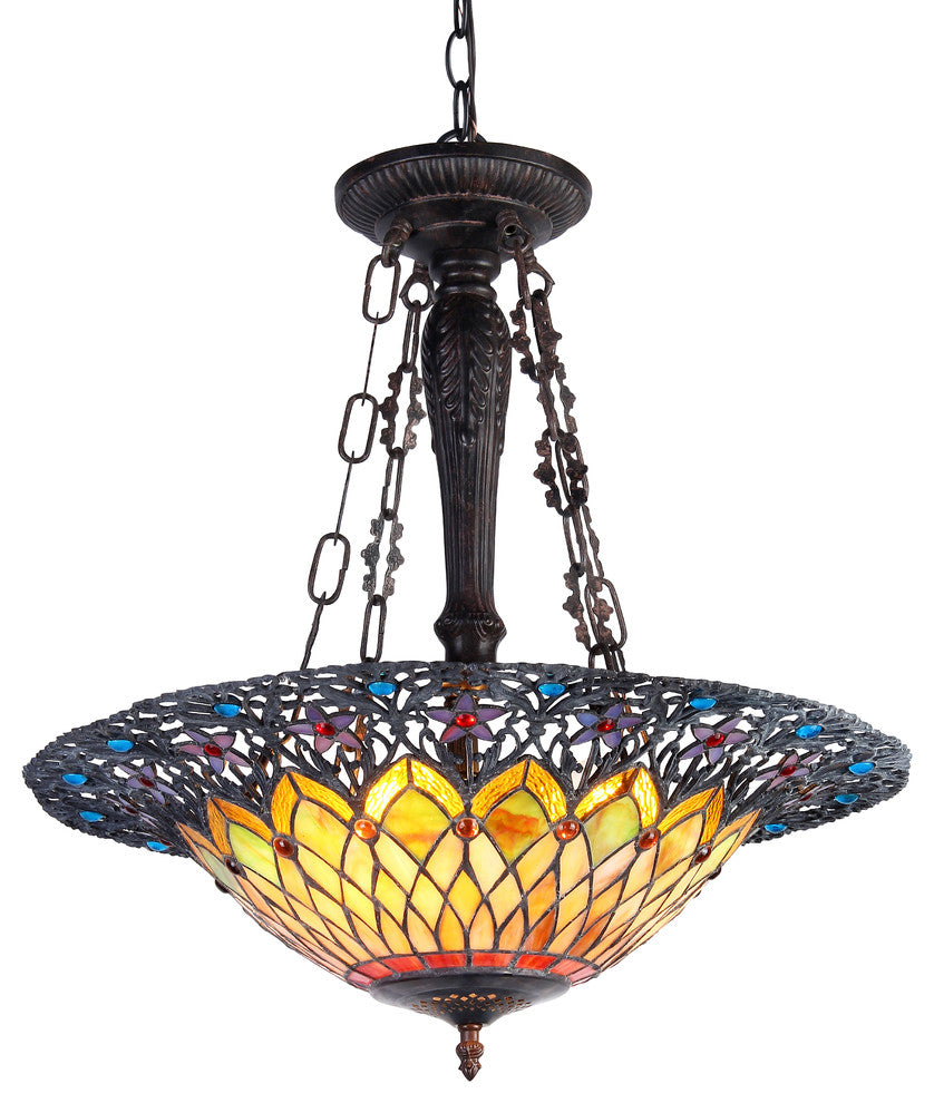 This Tiffany style traditional design 3-light inverted pendant features a antique bronze finish. Hand crafted from over 300 individually hand cut pieces of art glass and 64 cabochons that will add color and beauty to any setting.