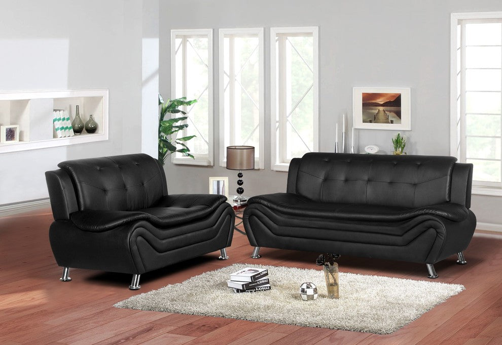 Bringing your living room look into the 21st century just got easier thanks to this two tone two-piece set.This black two piece set creates a sophisticated, Modern and glamorous look to your house.Foam padding lends comfort to the cushions and arms, while non-fussy polyurethane faux leather upholstery wraps around to tie these two all together.Each piece was designed to be comfortable, stylish, sturdy and built to last for years to come.Each piece is upholstered with top grade bonded leather for a smooth and easy to clean surface pillow top armrests for additional comfort and finally accented with stainless steel sofa legs to complete the look.This set works with any decor and will have you relaxing in modern comfort.Sofa dimentions 78"L-33"W-35"H, Loveseat dimentions: 61"L-33"W-35"H.