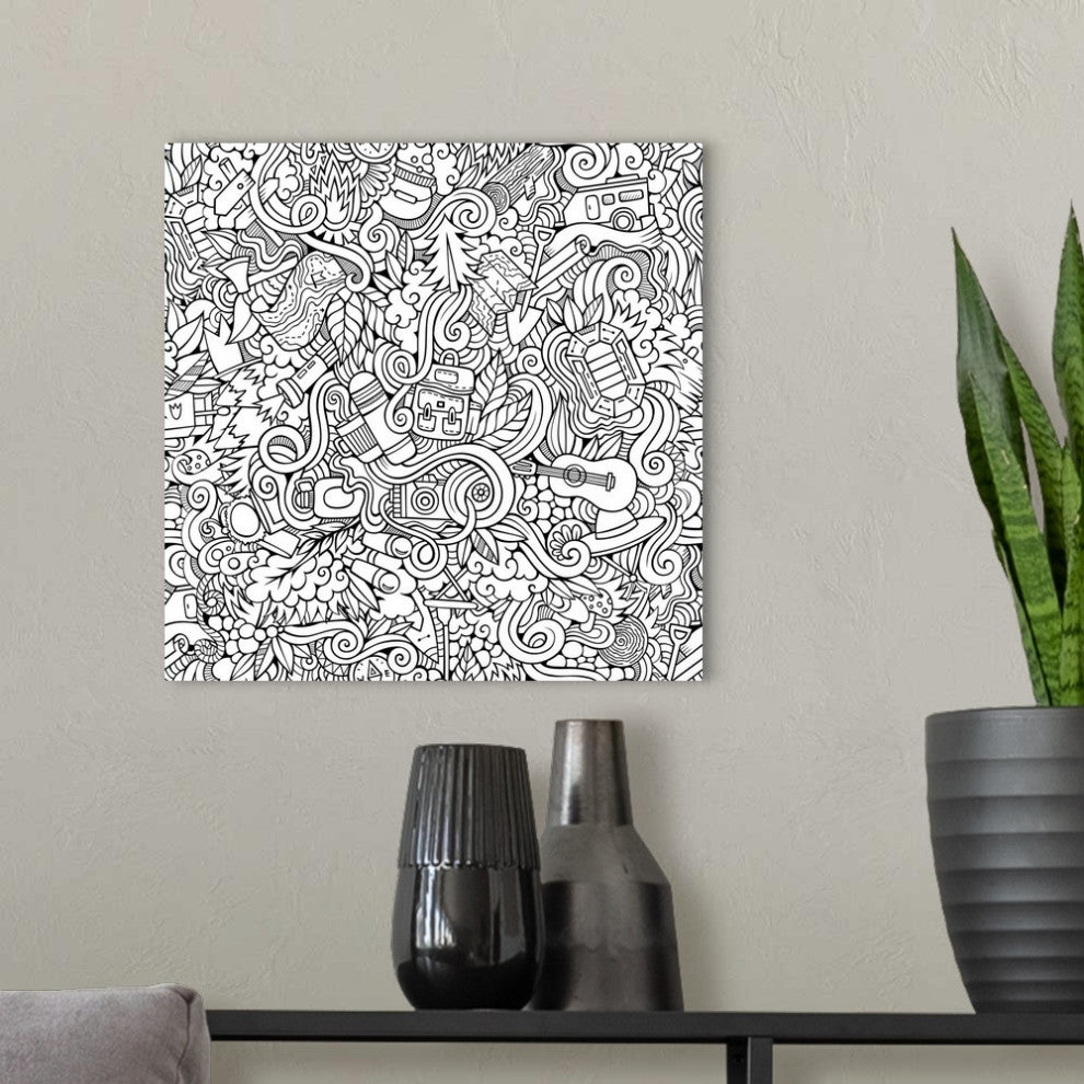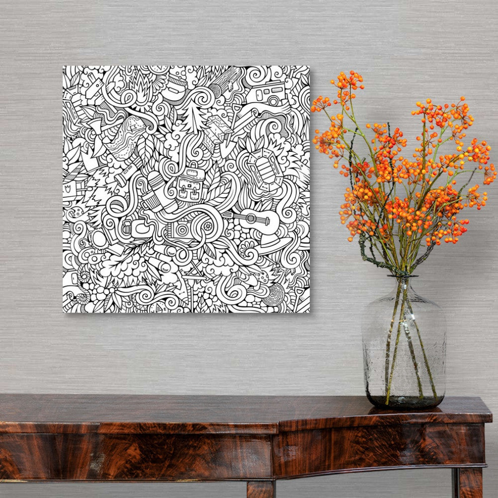 Gallery-wrapped canvas entitled, "Camping Design".An assortment of camping-themed objects, including backpacks, trees, and maps. Perfect for Coloring Canvas. Our wrapped canvases feature a proprietary design that prevents warping or sagging over time. By using archival inks and artist-grade canvas, our premium canvases are sure to add that extra touch to any space. Lastly, our canvases are finished with a closed back that incorporates pre-installed hanging hardware for easy installation.
