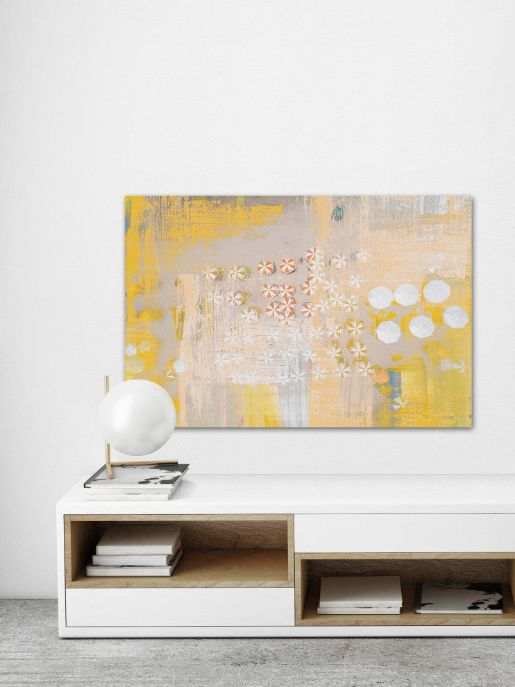 Striking and unique, the "Candy Umbrellas" Painting Print On Wrapped Canvas by Parvez Taj will bring your walls to life. Printed on canvas, this 30 inch wide by 20 inch tall contemporary artwork will make a statement in any living room, dining room, or bedroom.- Fine art canvas print by Parvez Taj- Professionally hand stretched- Gallery wrapped in sustainable, non-warping Wood- Arrives ready to hang- Made in the USA- Includes a certificate of authenticity- Artist signature on the front