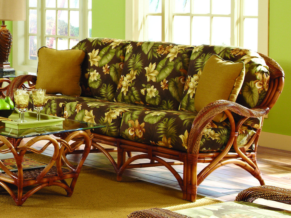 Soft, yet rugged, this well-designed Caneel Bay wicker conversation set captures the South Sea Islands perfectly. The flat-contoured cinnamon colored arms are comfortable and the twist in the wicker is unusual. Many fabrics will complement these pieces. Please refer to fourth image for fabric swatch. Toss pillow not included.