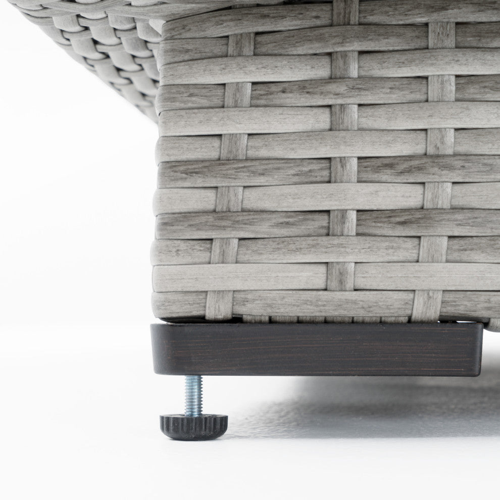 •  Hand-woven, gray resin wicker in a two-tone color weave is UV, weather, and water-resistant