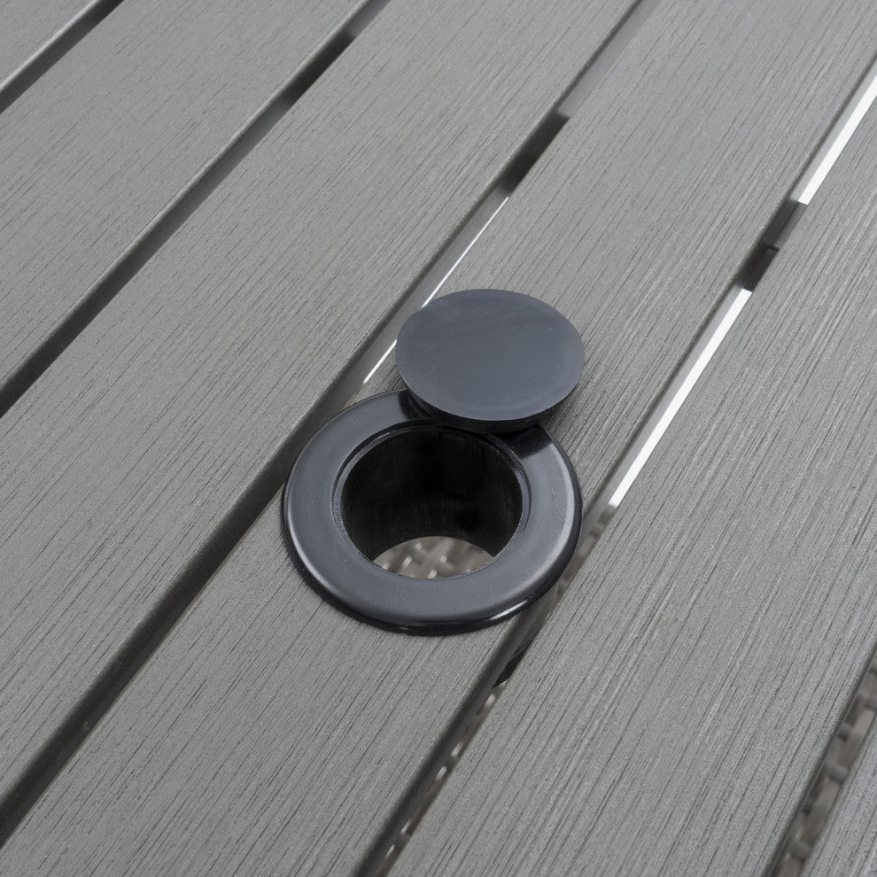 - Table features an umbrella hole for umbrellas with up to a 2-inch diameter, which can be covered when not in use