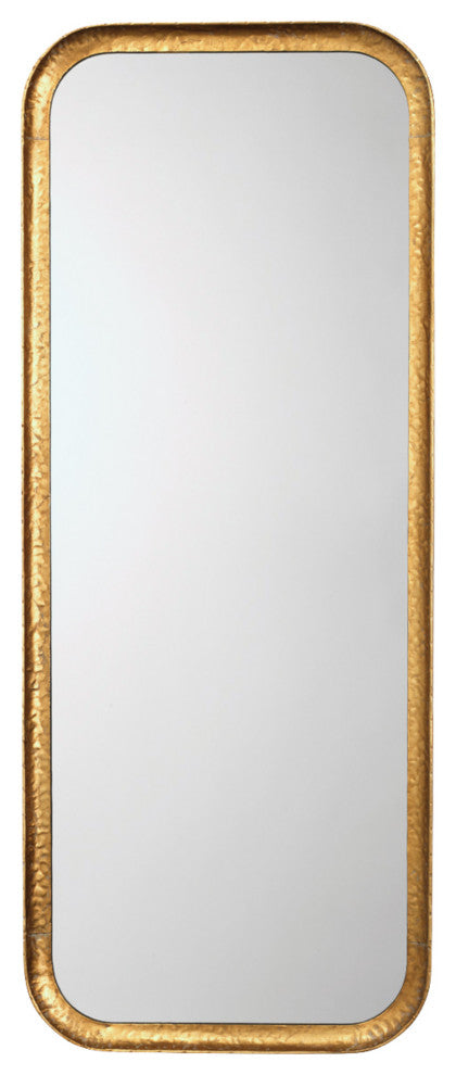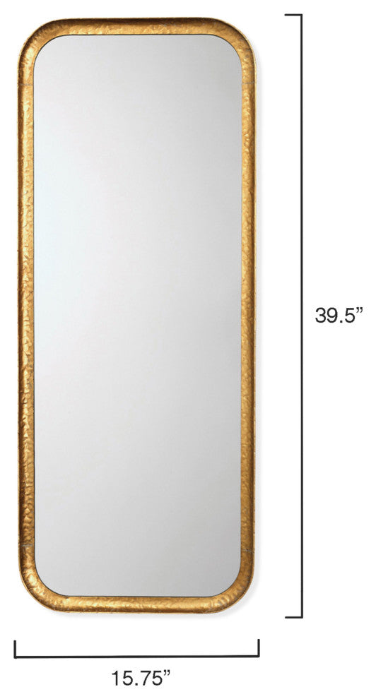 The clean lines of this contemporary wall mirror"™s frame are hand-forged of metal. Featuring gently rounded corners that soften the starkness of the design without distracting and the versatility of hanging horizontally and vertically. Group two or more together for a window-inspired display or use one to add height and dimension to any wall. •Expertly crafted of Iron and hand-finished in Gold Leaf•Non beveled glass mirror•Mirror can hang vertical or horizontal•Rustic frameThe inherent variations in tone and texture of hand-forged iron are preserved, to create pieces rich in detail and natural beauty. These unique imperfections give our products character and individuality, with each piece having its own personality. These unique imperfections and variations are what define our products, with each piece having its own personality. •Mirror Surface: 37.5"H x 13.75"W•D-Loop Hanging Mechanism•Frame: 1"W•MDF BackingCare Instructions: Wipe frame with a soft, dry cloth. Wipe glass with standard glass cleaner. DO NOT use cleaners or abrasives on mirror frame.