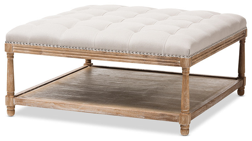 Carlotta French Country Weathered Oak Beige Linen Square Coffee Table Ottoman