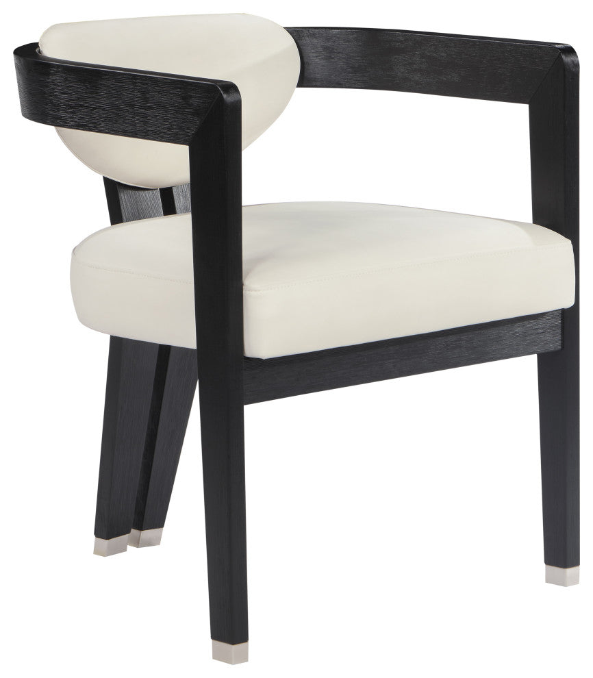 Modernize the feel of your dining room with this Carlyle vegan leather dining chair. Paired with the table of your choice, this chair adds a sophisticated finish to the overall look of your space. The chair has a solid wood frame with a wire-brushed black finish for the utmost in elegant aesthetics. The soft cream vegan leather upholstery feels soft and supple to the touch and offers long-wearing beauty without the maintenance requirements of the real thing.Overall Product Dimensions: 24" W x 23.5" D x 29" HSolid Wood Wire Brushed Black FinishSoft Cream Vegan LeatherBrushed Chrome AccentsContemporary DesignSeat Dimensions: Seat Width: 21.5"Seat Height: 19.3"Seat Depth: 19"Arm Height: 27.6"Back Height: 10.1"
