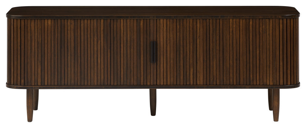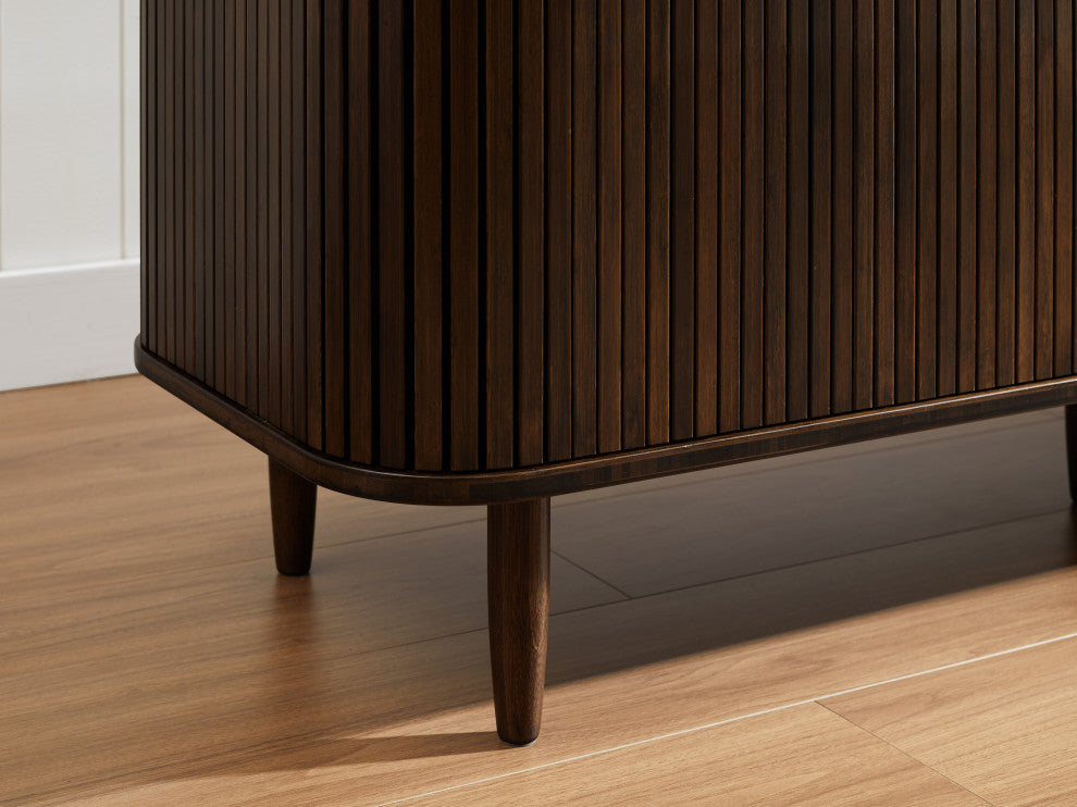 The Carmel console celebrates exquisite craftsmanship with a design that effortlessly anchors any living space. Its soft, rounded corners elegantly conceal tambour doors that glide open to reveal a spacious interior with four shelves, offering both style and practicality for storing your essentials. The sleek vertical pulls and gracefully tapered legs complete the piece, lending a timeless sophistication and refined elegance.