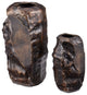Brutalist in style, the Carmelo Vase Set includes two cast aluminum vessels in a scorched bronze finish that brings the surfaces a warm gleam. The organically shaped profiles look as if they were born during the famous time in design history when brutalism was at its height. Made in two parts and joined with a welding process, these vases are designed for use only with artificial flowers.
