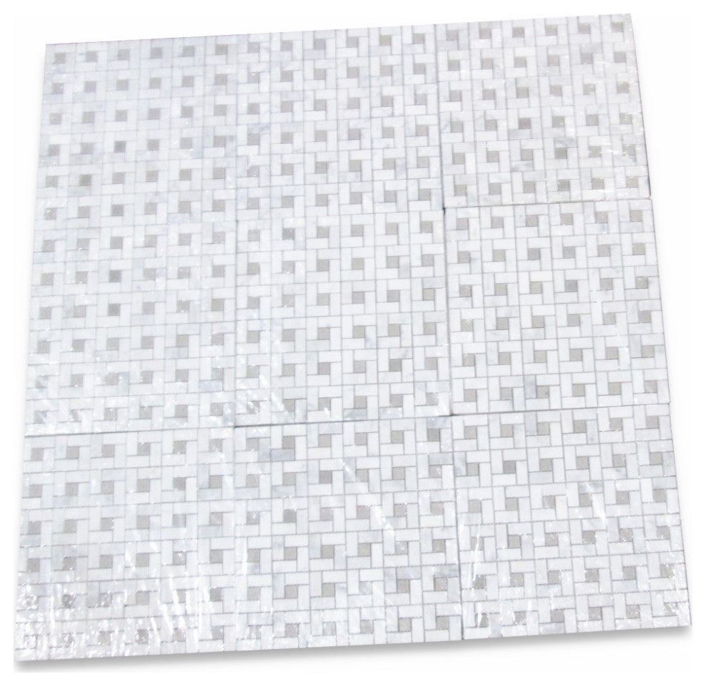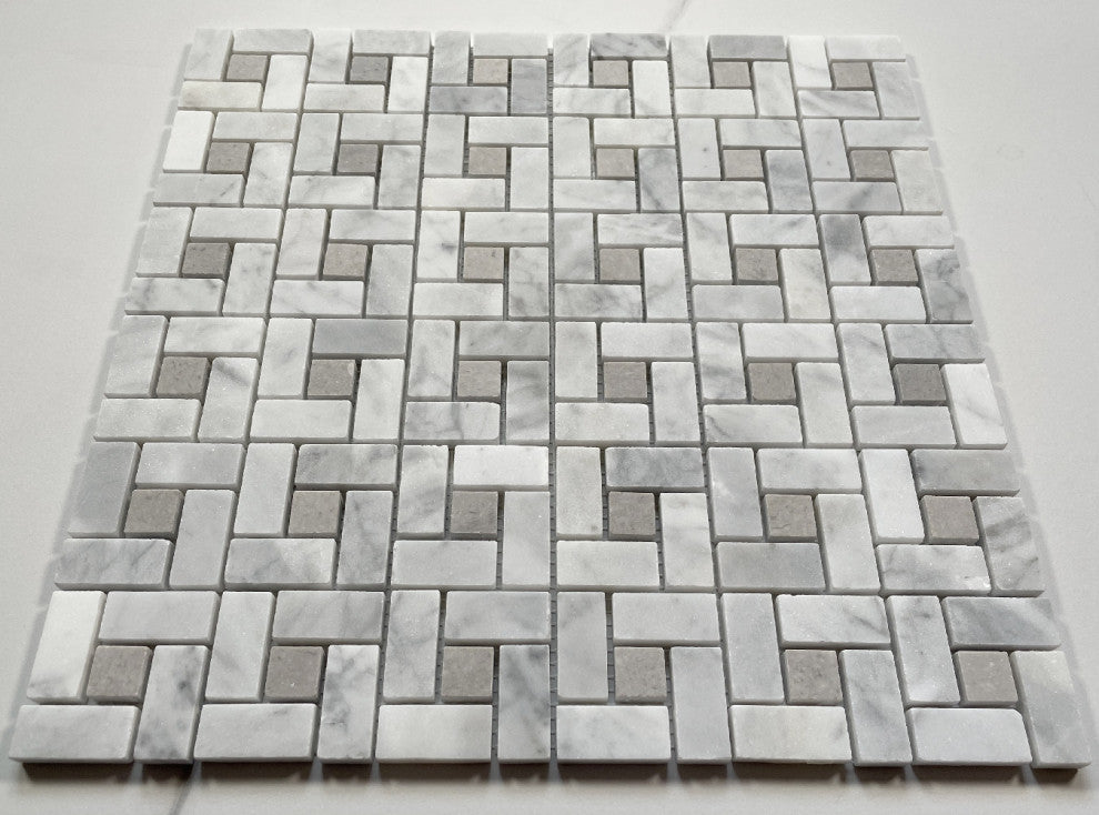 Carrara White Marble 9/16x1 3/16" rectangle pieces and gray 9/16" dots mounted on 12x12" sturdy mesh tile sheet12 rows and 12 columns with 144 stones and 36 dots on each sheet; 5/16" thickness; Honed finishFirst Quality; Natural Beauty; Carefully Selected; Consistent in size and finish; Factory DirectPrice per sheet (1 sq.ft.); Large quantities in stockPremium Grade Pinwheel White Carrara Marble Mosaic Tile. Italian Bianco Carrera White Venato Carrara Honed Windmill Pattern Mosaic w/ Gray Dots Wall and Floor Tiles are perfect for any residential / commercial projects. The Carrara White Marble Spiral Mosaic Tile with Cinderella Gray Dots can be used for kitchen backsplash, bathroom flooring, shower surround, dining room, entryway, corridor, kitchen backsplash, spa, etc. Our timeless Matte White Carrera Marble Pinwheel Windmill Mosaic Tile with a large selection of coordinating products is available and includes hexagon, herringbone, brick mosaics, 12x12, 18x18, 24x24, subway tile, moldings, borders, and more.Number of Pieces Included: 1Sq. ft. in 1 Quantity: 1Mesh Backing
