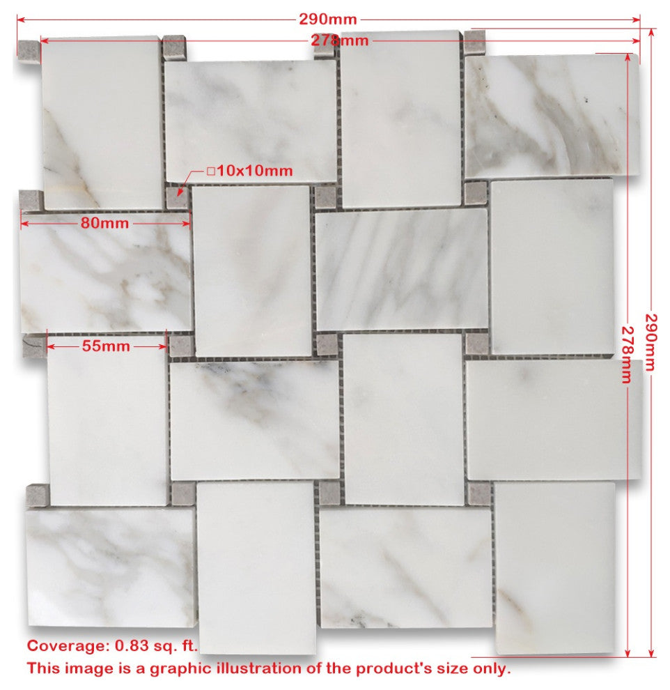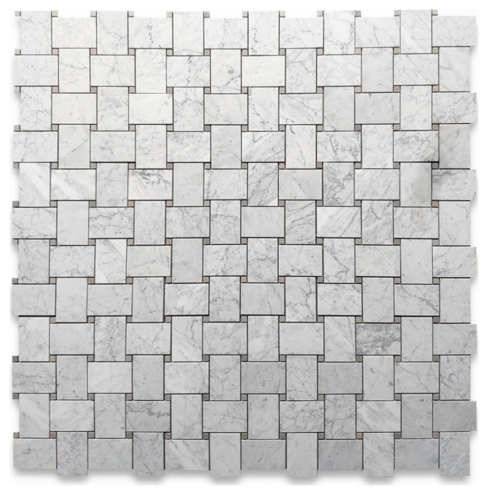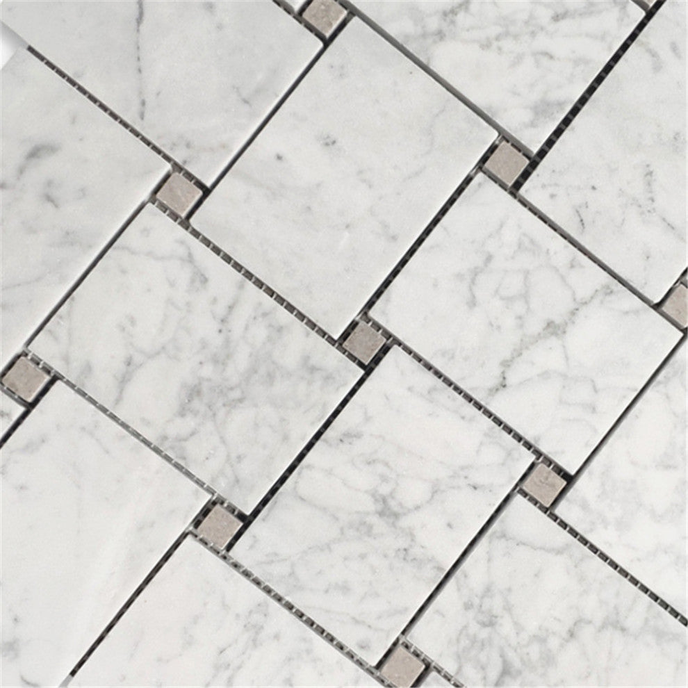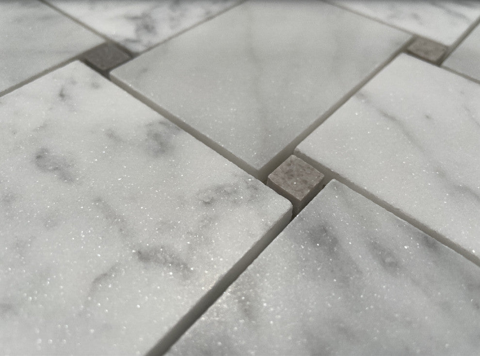 Carrara White Marble 2 1/4x3 1/8" rectangle pieces and Gray 1/2" dots mounted on 11x11" sturdy mesh tile sheet4 rows and 4 columns with 16 stones and 16 dots on each sheet; 5/16" thickness; Honed finishFirst Quality; Natural Beauty; Carefully Selected; Consistent in size and finish; Factory DirectPrice per sheet (0.84 sq.ft.); Large quantities in stockPremium Grade Basketweave White Carrara Marble Mosaic Tile. Italian Bianco Carrera White Venato Carrara Honed Large Basket Weave Mosaic w/ Gray Dots Wall and Floor Tiles are perfect for any residential / commercial projects. The Carrara White Marble 2 1/4 x 3 1/8 inch Basketweave Mosaic Tile with Cinderella Gray Dots can be used for kitchen backsplash, bathroom flooring, shower surround, dining room, entryway, corridor, kitchen backsplash, spa, etc. Our timeless Matte White Carrera Marble Large Basketweave Mosaic Tile with a large selection of coordinating products is available and includes hexagon, herringbone, brick mosaics, 12x12, 18x18, 24x24, subway tile, moldings, borders, and more.Number of Pieces Included: 1Sq. ft. in 1 Quantity: 0.84Mesh Backing