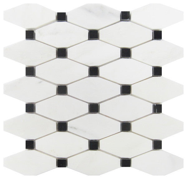 Arabescato Carrara Octave 12x12 Interlocking Polished Mosaic with black marble inserts has perfect blend of colors for your upcoming project. Design includes 2" x 4" marble mosaic beautifully integrated onto a meshed sheet for easy installation. Recommend