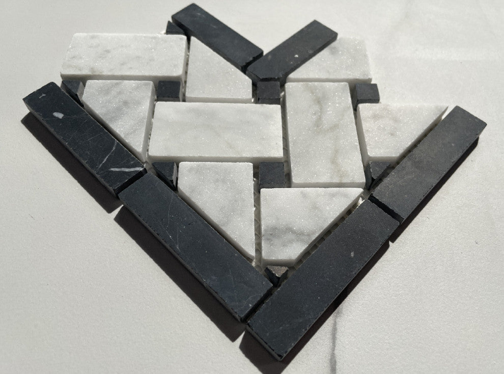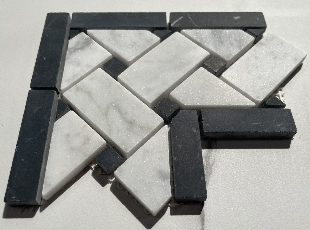 Premium Carrara White Marble pieces mounted on 4x4" sturdy mesh tile sheet5/16" thickness; Honed finishFirst Quality; Natural Beauty; Carefully Selected; Consistent in size and finish; Factory DirectPrice per sheet; Large quantities in stockPremium Grade Basketweave White Carrara Marble Corner tiles. Italian Bianco Carrera White Venato Carrara Honed 4 x 4 Basket Weave Mosaic Corner with Black Dots Tiles are perfect for any interior/exterior projects. The Carrara White Marble Basketweave Mosaic Corners with Nero Marquina Black Dots can be used for a kitchen backsplash, bathroom flooring, shower surround, countertop, dining room, entryway, corridor, balcony, spa, pool, fountain, etc. Our Premium White Carrera Marble Basketweave Mosaic Corners with a large selection of coordinating products is available and includes hexagon, herringbone, brick mosaics, 12x12, 18x18, 24x24, subway tiles, moldings, borders, and more.Number of Pieces Included: 1Sq. ft. in 1 Quantity: 0.11Mesh Backing