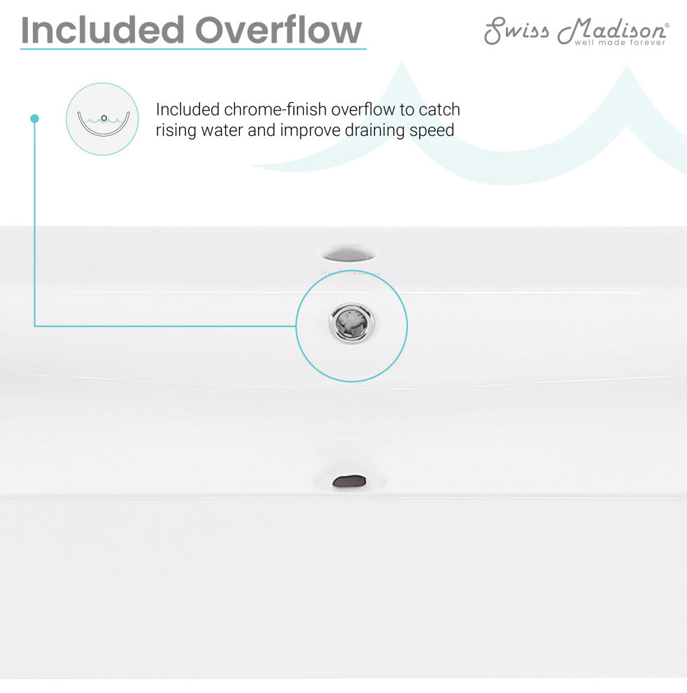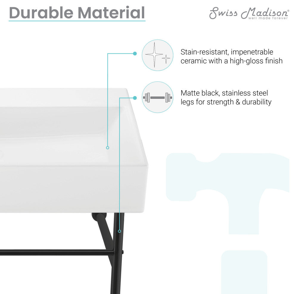 The Carre console sink ushers in your guests with a powerful and bright character. The widened washbasin offers increased ease of access. An open design makes the room appear more spacious and candid.FEATURES:Black legs provide rigid support and include a towel barCenter Faucet mounting holeGlossy porcelain finish makes the sink easy to clean and elegant to the eye.Overflow drain included1 Year Limited Warranty IncludedDimensions: 35.5" x 16.5" x 35.5"
