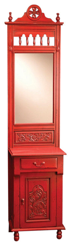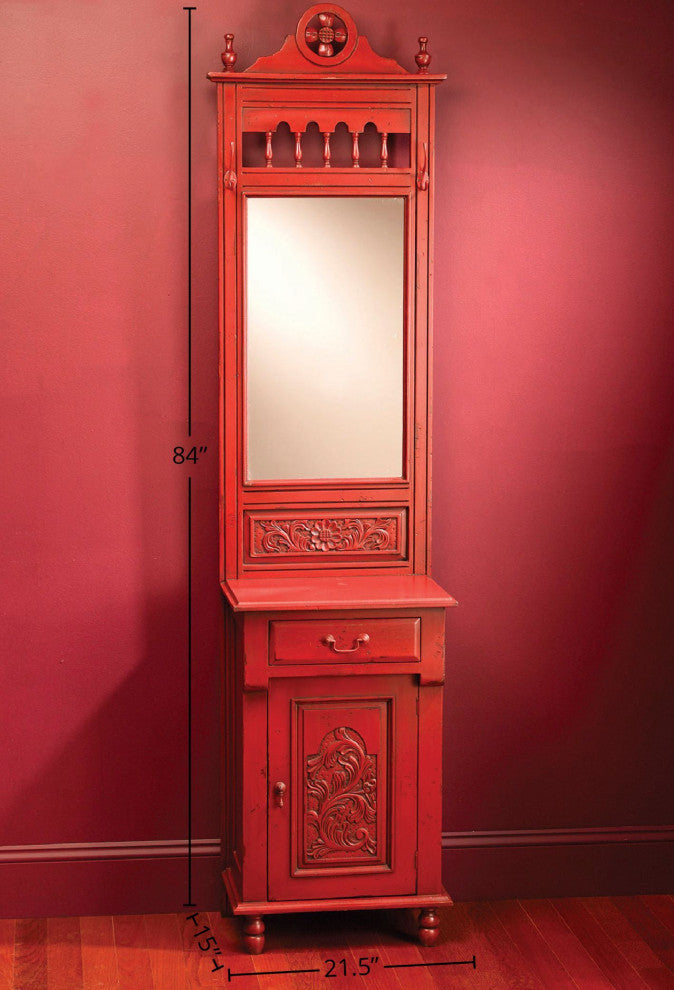 Place the Carrol Hall Tree at your entryway for storage. It brings strong antique, traditional design that is full of character and taste. It comes with a mirror, a single drawer, and a cabinet storage underneath for your various items. Carved details are engraved in this piece which gives that sense of antiquity.Features:Overall product dimensions are 21.5" W x 15" D x 84" HConstructed from solid woodThe hall tree comes with a mirror, drawer, and a cabinet storageBrings traditional and antique aestheticsAvailable in multiple color variationsDimensions:Hall TreeAssembled Product: 21.5 inches wide x 15 inches deep x 84 inches high.
