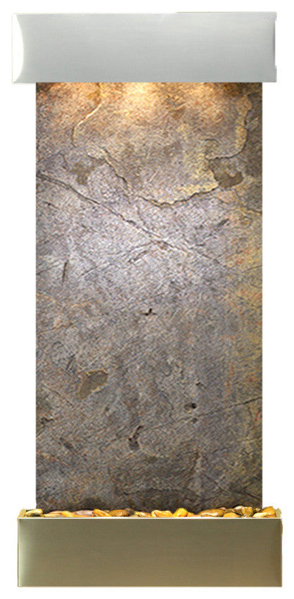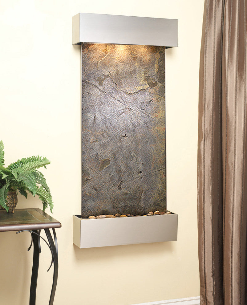 Come home and relax to the peaceful sounds of running water. The Cascade Springs water fountain is made with natural materials to enhance the feeling of the great outdoors in your room. This wall water feature includes our EZ install bracket and all hardware necessary to hang it on a sheet rock wall. With many different trim and water surface options, you are sure to find the perfect Cascade Springs for your space.25" L x 54" H x 6" D, easy to hang, complete with colored instructions and hardware for hanging on a sheetrock wall. Hanging Weight 65 lbs. This unit includes: 2 halogen light Polished river rocks Electric pump 3-way pull chain that allows you to run just lights, just water, or lights and water. Welded plastic liner insures against leaking and unique water distribution unit system will not clog. 110V, 100W; one cord operates entire unit; 90 degree plug can be concealed behind water feature. Durable powder coat finish; Manufactured and assembled in the USA with a 1 year limited warranty. • This light-weight slate veneer known as FeatherStone is natural stone and therefore may differ in color and texture from the photos shown.