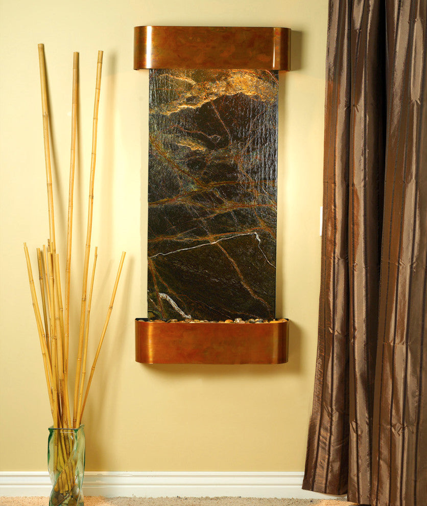 Come home and relax to the peaceful sounds of running water. The Cascade Springs water fountain is made with natural materials to enhance the feeling of the great outdoors in your room. This wall water feature includes our EZ install bracket and all hardware necessary to hang it on a sheet rock wall. With many different trim and water surface options, you are sure to find the perfect Cascade Springs for your space.25" L x 54" H x 6" D, easy to hang, complete with colored instructions and hardware for hanging on a sheetrock wall. Hanging Weight 165 lbs. This unit includes: 2 halogen light Polished river rocks Electric pump 3-way pull chain that allows you to run just lights, just water, or lights and water. Welded plastic liner insures against leaking and unique water distribution unit system will not clog. 110V, 100W; one cord operates entire unit; 90 degree plug can be concealed behind water feature. Durable powder coat finish; Manufactured and assembled in the USA with a 1 year limited warranty. • All marbles are natural and may differ in color and texture from the picture shown due to their natural uniqueness.