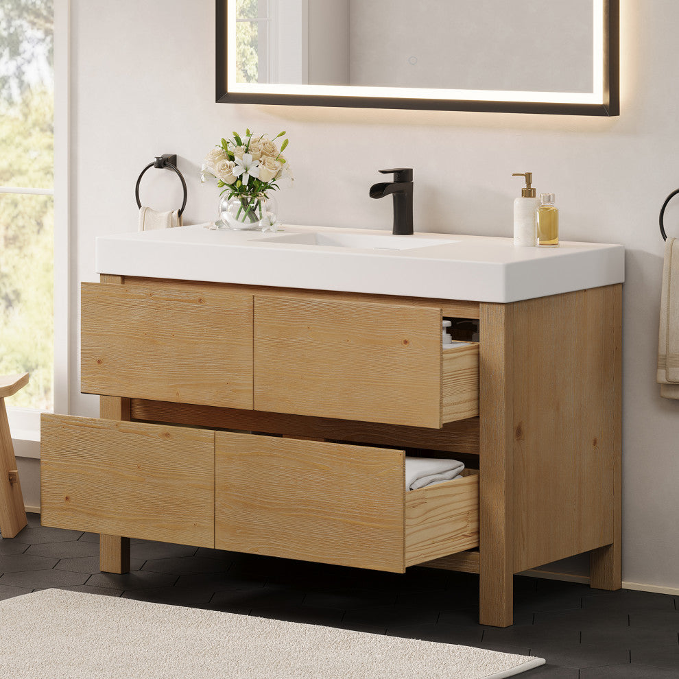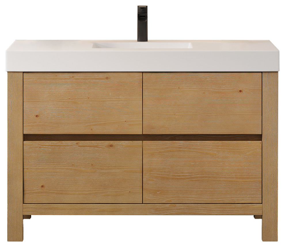 Upgrade your private sanctuary with our Cascadia Series Bathroom Vanity, intelligently designed to merge versatile contemporary design with everyday practicality. This piece features a gleaming-white artificial-stone countertop with an integrated sink as well as sleek, handle-less drawer panels made of weathered fir veneer. Built for durability and longevity, the Cascadia also has ample storage to keep your essentials neatly tucked away. It offers striking good looks and high-impact style that instantly enhances any type of decor.