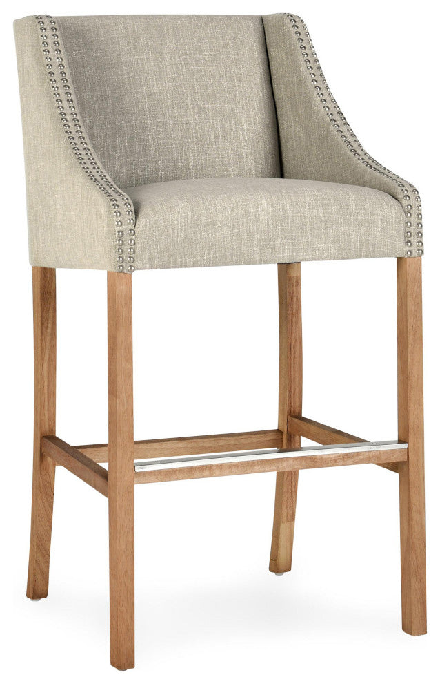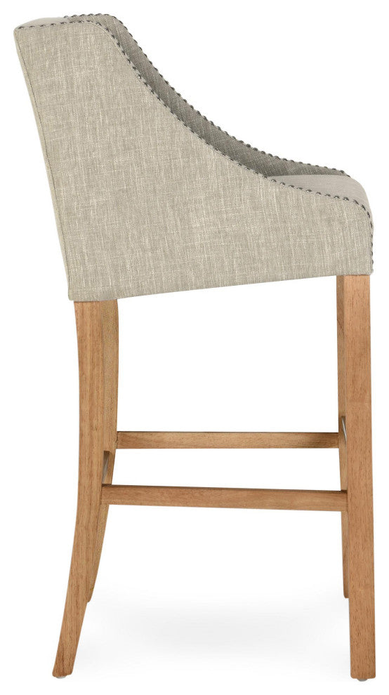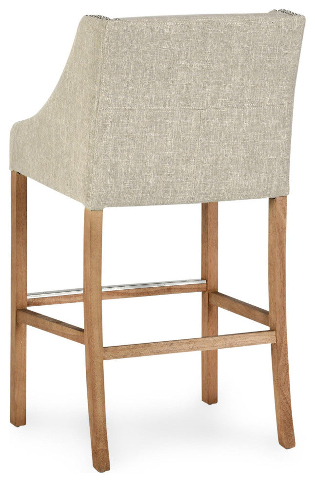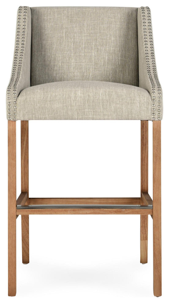 Our Castaic Barstool is a clean lined seating option accented with timeless detailing. Upholstered in a blended fabric with neutral hues, the seating this highlighted by double rows of nail heads, meticulously placed by skilled artisans. The honey-brown shade of the solid legs, bring a subtle contrast and the metal bar on the foot rest adds to the stylish elements of the chair.