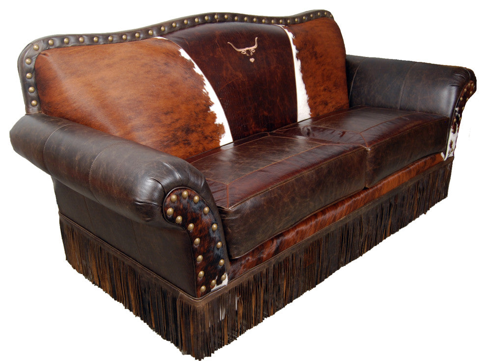 This is our standard 2 cushion 92" camel back sofa. Here it has been covered with dark brindle Brazilian cowhide on the in-back, arm panels, and seat rail. The in-arms, out-arms, out-back, top rail and cushion centers are upholstered with our full grain "Buffalo" leather. To further customize this piece we added a "V" insert of gator embossed leather in the in-back, gator embossed leather on the border of the cushions, antique brass nail heads, top stitching on the arms, 13" hand-cut fringe, and an embroidered longhorn in the middle of the "V" insert.