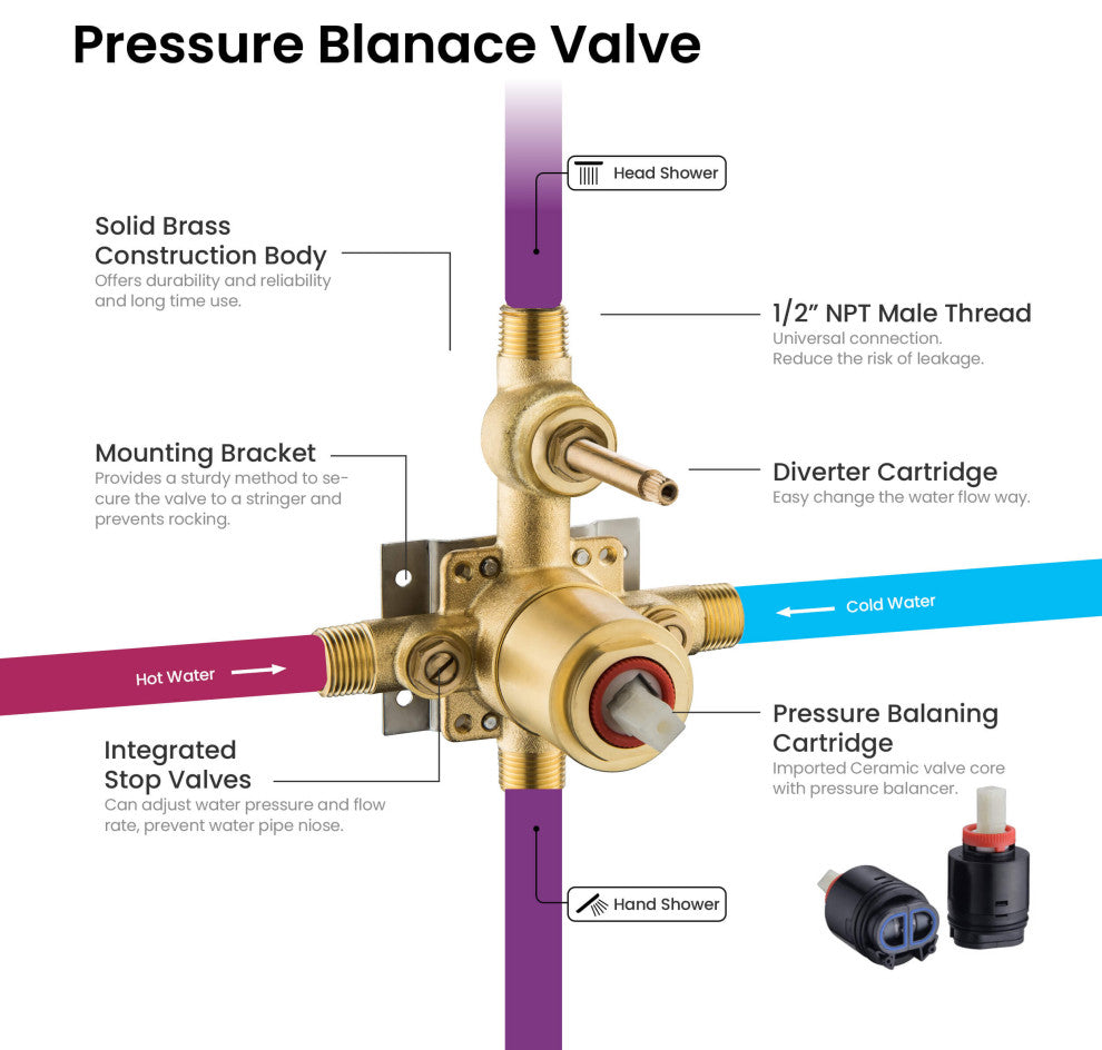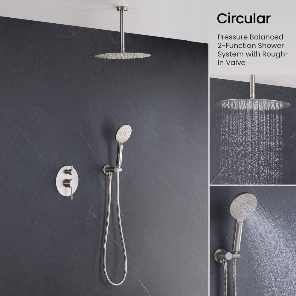 Elevate your shower experience extraordinarily with this Kibi Circular 2 function Shower System. This shower system is not only sleek in simplicity but also practical in function, which includes 8" ceiling mount shower arm, 10" thin profile brass rain shower, 3 function premium ABS hand shower, 60" stainless steel extended hose, solid brass construction, branded pressure balance valve as well as all necessary escutcheon plate and installation hardware. Dual Functionality: Offering two distinct showering experiences, the system includes a 10" stainless steel rain shower head for a luxurious rainfall sensation and a versatile 3-mode handheld shower head, providing flexibility for different shower preferences. Durable Brass Rough-In Valve: Equipped with a durable brass rough-in valve, this system ensures robust water control, maintaining consistent water pressure and temperature regulation for a safe and comfortable showering experience. 3-Mode Handheld Shower Head: The included handheld shower head offers three different spray modes, allowing for targeted rinsing, gentle mist, or a combination setting for a versatile and personalized bathing experience. User-Friendly Controls: Designed for ease of use, the system''s controls provide straightforward operation, enabling effortless switching between the rain shower and handheld modes, offering convenience during your shower. Simple Installation Process: With clear installation instructions and necessary hardware, setting up this shower system is straightforward, facilitating a secure and leak-free connection to your existing plumbing system.