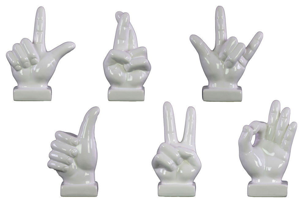 Ceramic Hand Signal Sculpture on Base Assortment of Six Small Gloss Finish White