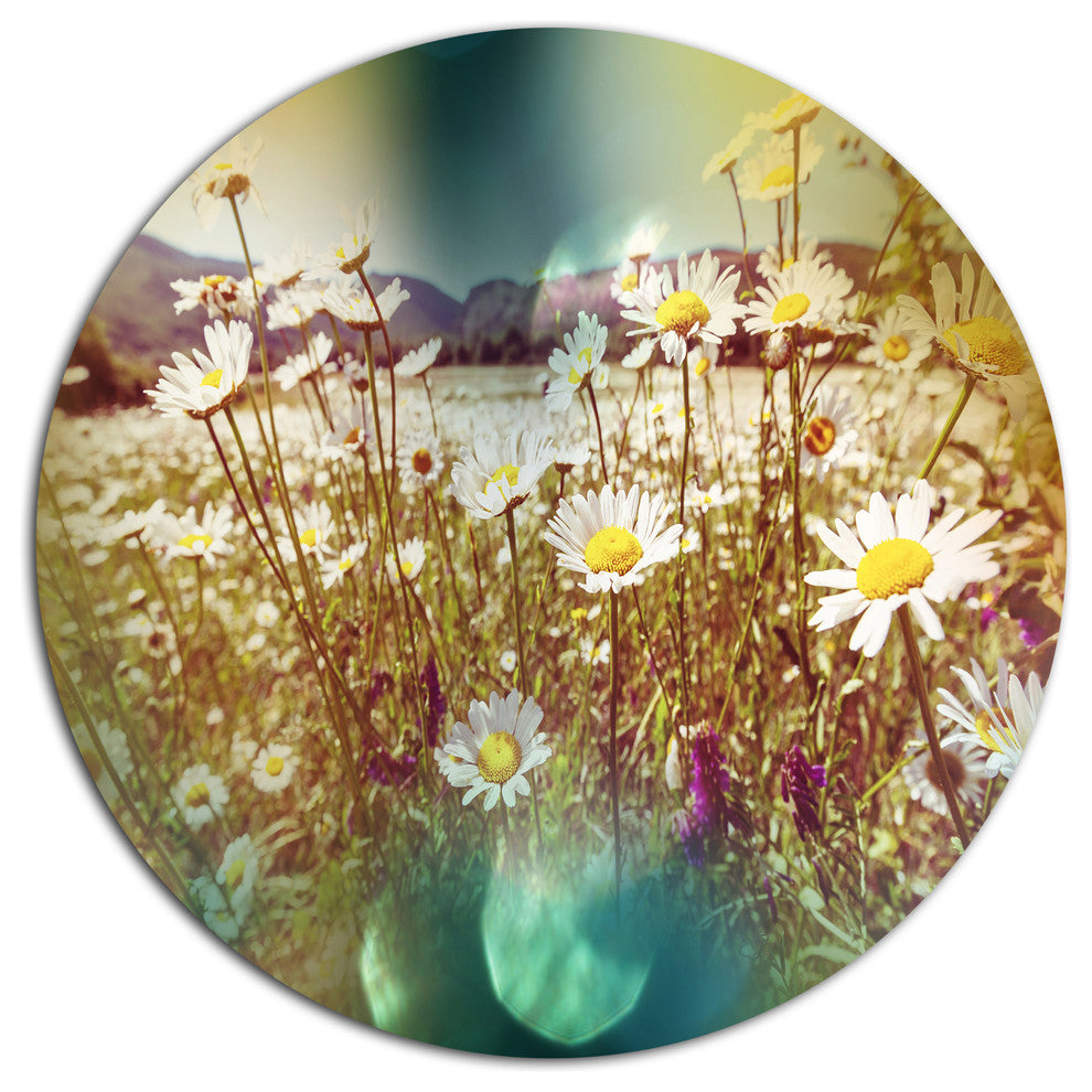 Bring Contemporary Abstraction to your home with this large Circle Metal wall art. This Chamomile Flowers in Summer Garden Metal Artwork makes it the focal point of any room or office.