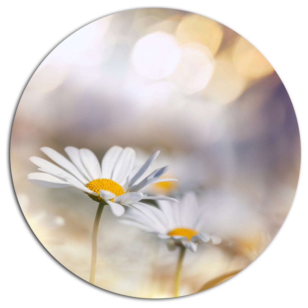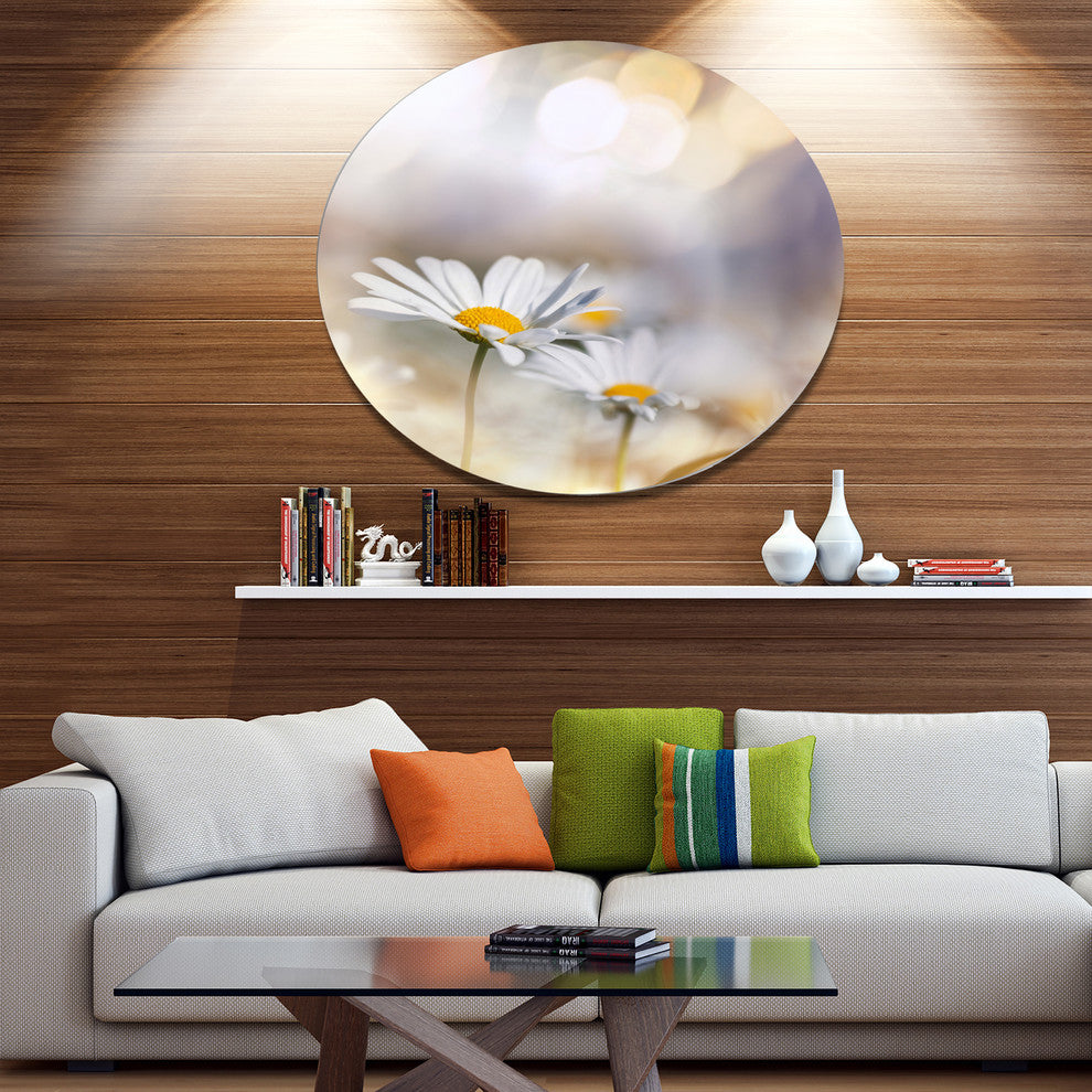 Bring Contemporary Abstraction to your home with this large Circle Metal wall art. This Chamomiles on Blue Background Metal Artwork makes it the focal point of any room or office.
